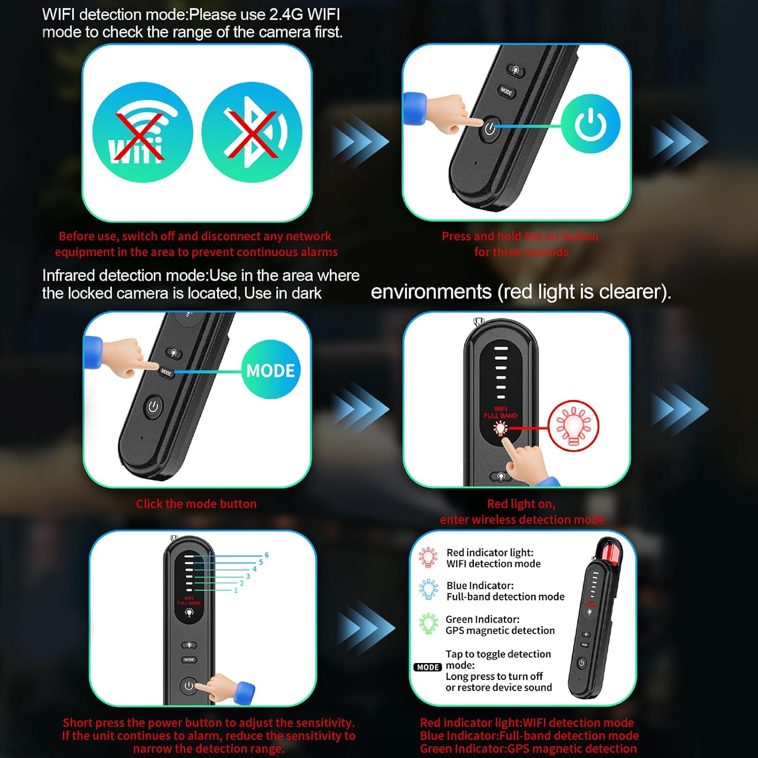 4 in 1 Hidden Camera Detectors: This hidden camera detectors incorporates 4 features. Hidden Camera 1. RF Signal Detection to detect active RF bug transmitters like transmitting camera,GPS tracker. Hidden Camera 2. Camera Lens Finder&Camera Detector to spot the hidden pinhole camera by a simple visual inspection via infrared laser scanning. Hidden Camera 3. Magnetic Field Detection to find the unwanted widely used magnetized GPS trackers. Hidden Camera 4.Flashlight, no more worries even in dark environment