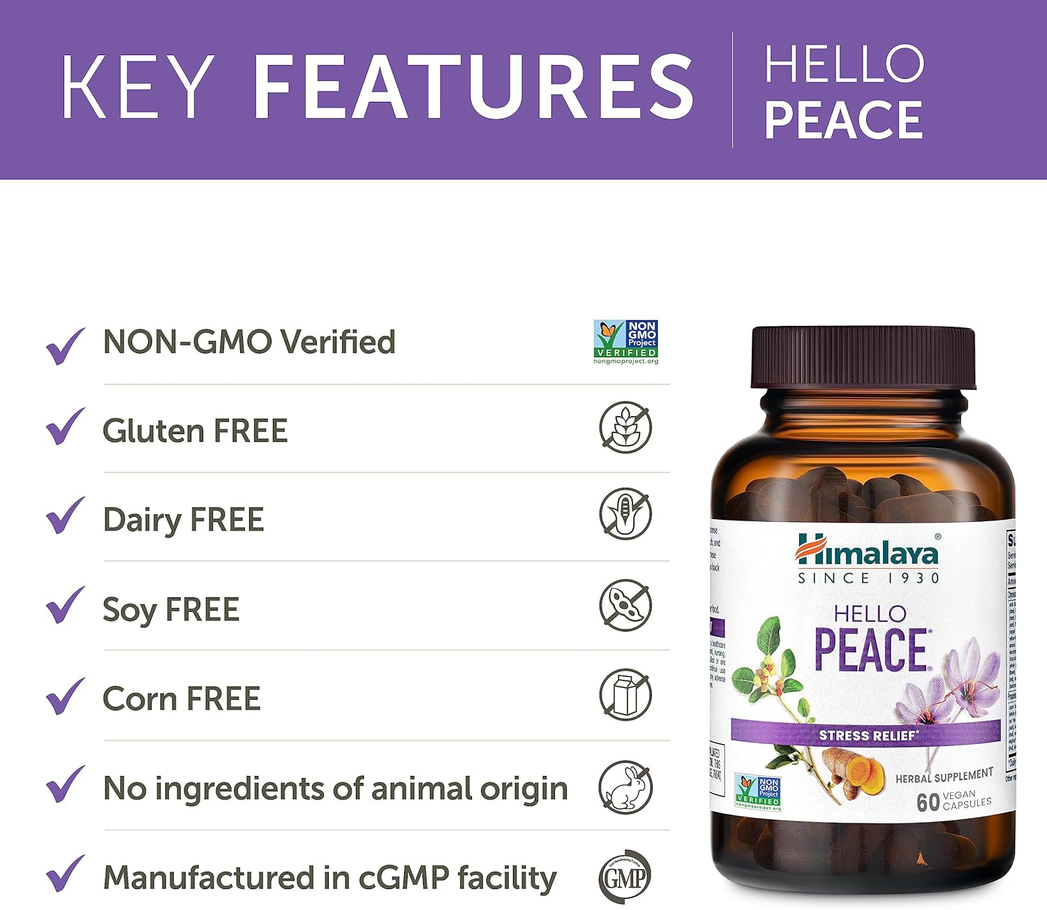 Himalaya Hello Peace – Herbal Stress Relief Supplement with Ashwagandha and Turmeric for Normal Cortisol and Adrenal Support – Vegan, Non-GMO, Gluten Free, 60 Capsules