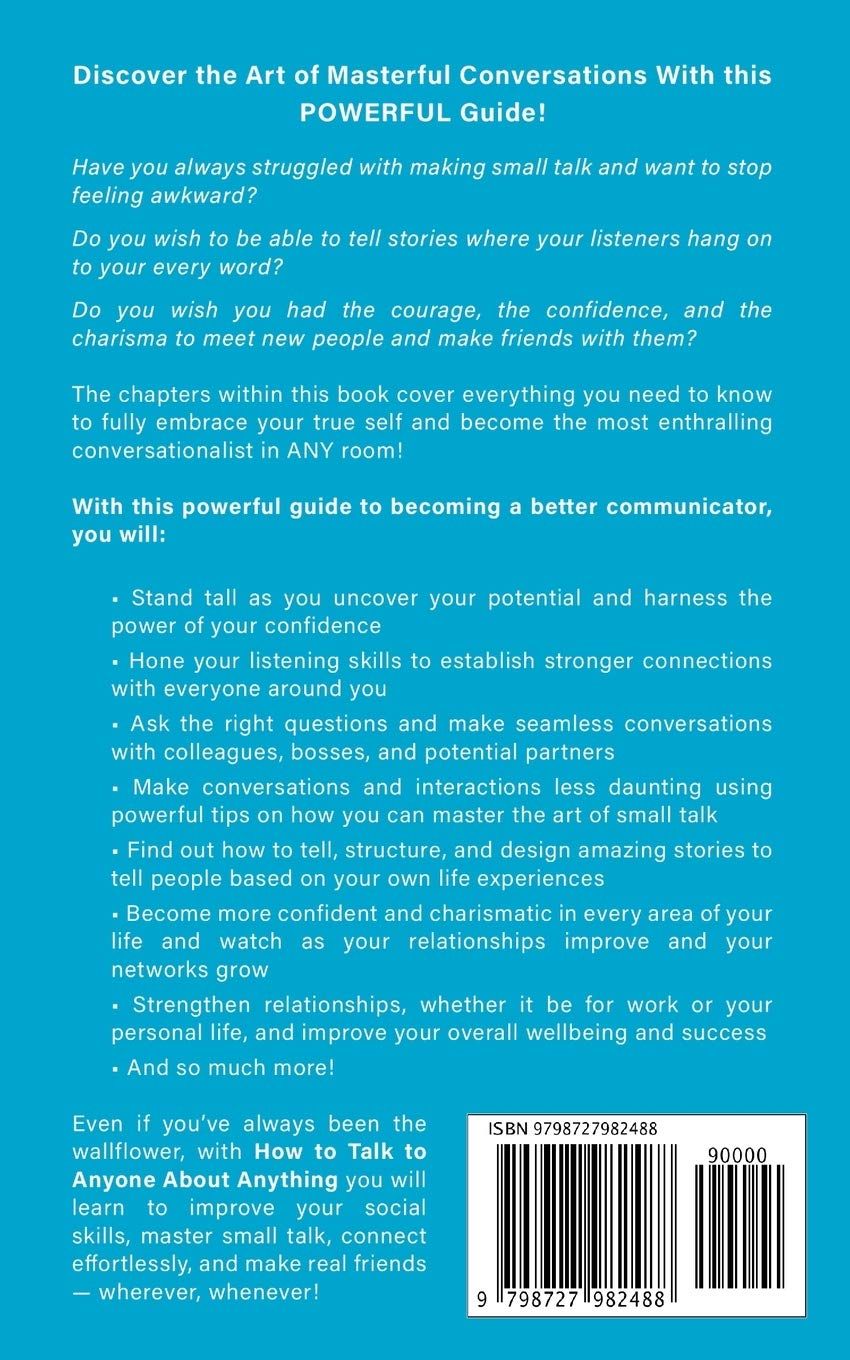 With this powerful guide to becoming a better communicator, you will:Stand tall as you uncover your potential and harness the power of your confidenceHone your listening skills to establish stronger connections with everyone around youAsk the right questions and make seamless conversations with colleagues, bosses, and potential partnersMake conversations and interactions less daunting using powerful tips on how you can master the art of small talkFind out how to tell, structure, and design amazing stories to tell people based on your own life experiencesBecome more confident and charismatic in every area of your life and watch as your relationships improve and your networks growStrengthen relationships, whether it be for work or your personal life, and improve your overall wellbeing and successAnd so much more!