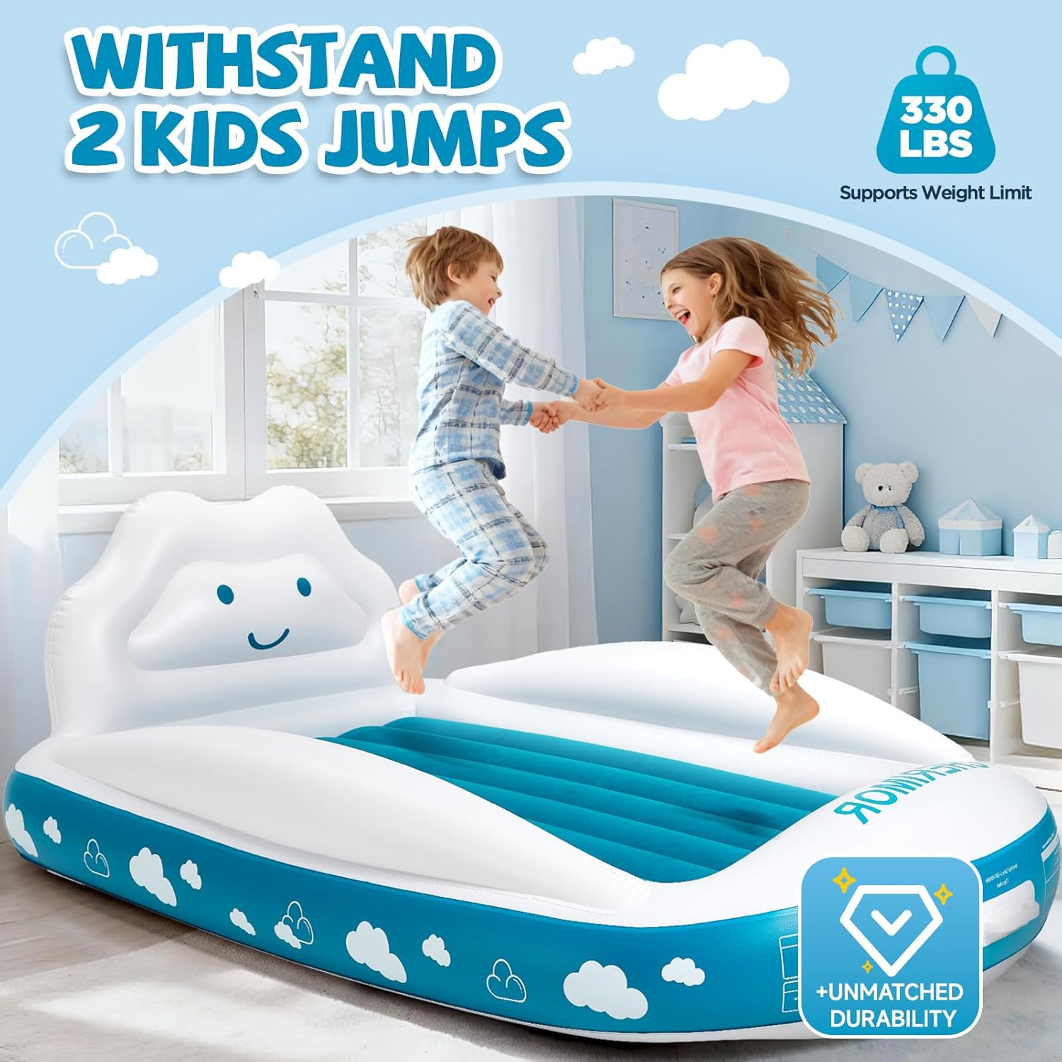 Extra-Tall Safety Bumpers & Ultra-Soft Flocked Comfort: The built-in 11-inch safety bumpers are designed higher than many travel beds, providing a secure barrier that keeps your child safely inside, even during restless sleep. The sleeping surface of kids air mattress is covered in a velvety-soft flocked material that is gentle on sensitive skin, offering a cozy and comforting touch for toddlers fall asleep faster