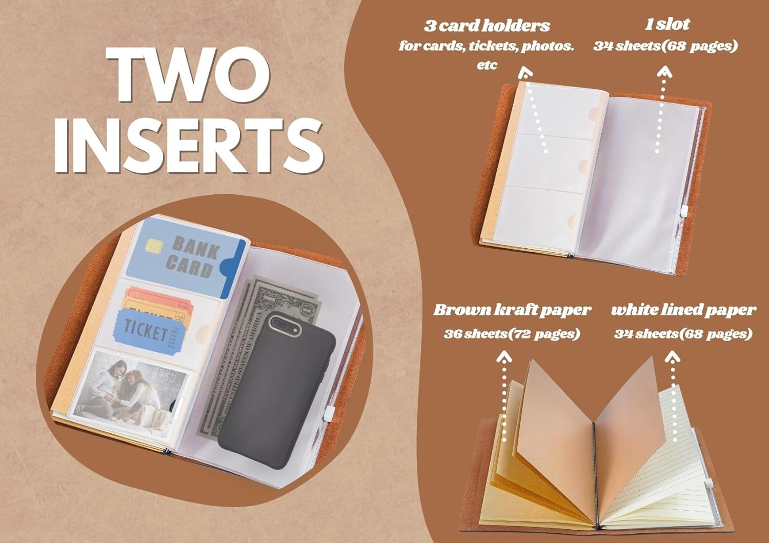 Multifunctional – Designed for easier reading and notes taking. It would be the perfect handy choice for you during daily uses, journeys, and work. Card slot bags are also included to organize your cards, tickets, photos, etc. And also a page-size slot with zipping for storing cash, cell phone, and more.