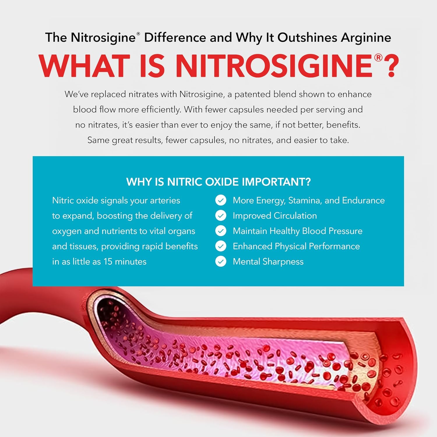 IMPROVES MENTAL CLARITY & PERFORMANCE: Our blood flow supplement for men and women can also help boost mental clarity, mood and support metabolic efficiency. Our unique formula has its ability to help on the cellular level and that means it leaves you feeling good, looking good, and most importantly healthy from the inside out. The Nitrosigine nitric oxide booster will support your overall well being