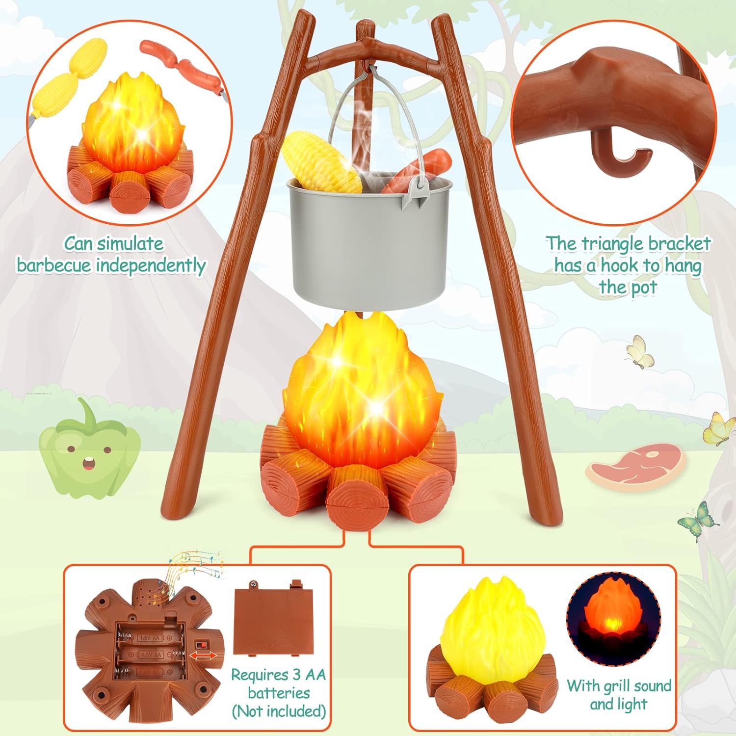 Kids Camping Toys Set, Pretend Play with Campfire, Pretend Cutting Food for Play Kitchen Camping Gear for Kitchen Indoor Outdoor Camping Toys for Kids Toddlers Boys Age 3 4 5 6 7 8+