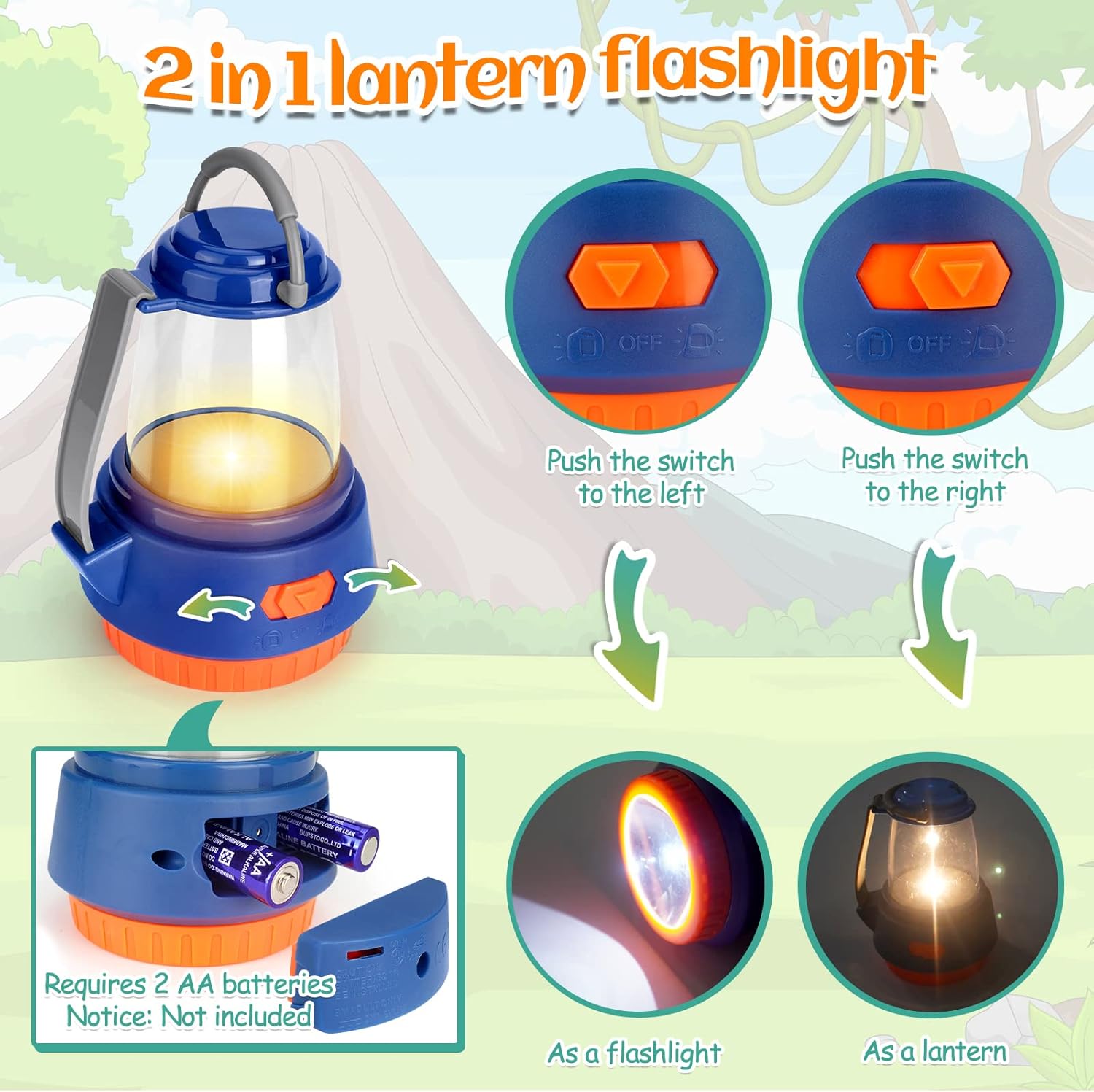 【Kids Camping Set Simulates Real Camping】We designed this special campfire just for this toy camping set. Simulate a real wild campfire that glows like a red flame and makes a crackling barbecue sound. Light up the oil lamp and find the secrets of the night in the dark. Comes with a 2-in-1 lantern flashlight, if it gets dark, press the oil light switch to help you illuminate the road ahead. At the same time, it can be turned into a flashlight