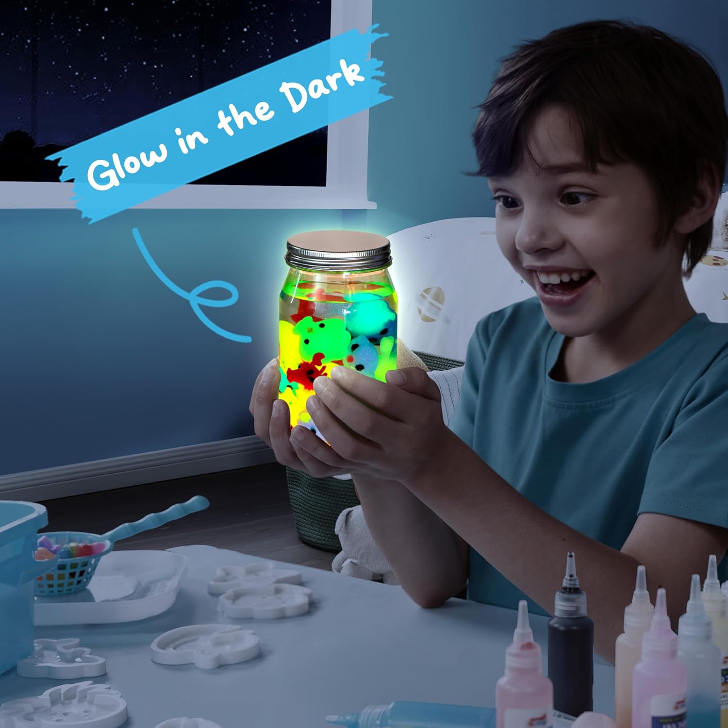 Create, Glow & Store:Squeeze the magic glow gels into the molds, dip them in water, and watch as they magically transform into adorable water pals. Let them soak up light, and they’ll shine bright in the dark like tiny underwater stars! Even better, kids can keep their glowing creations safe and proudly display them in the included storage jar for endless play and show-and-tell fun