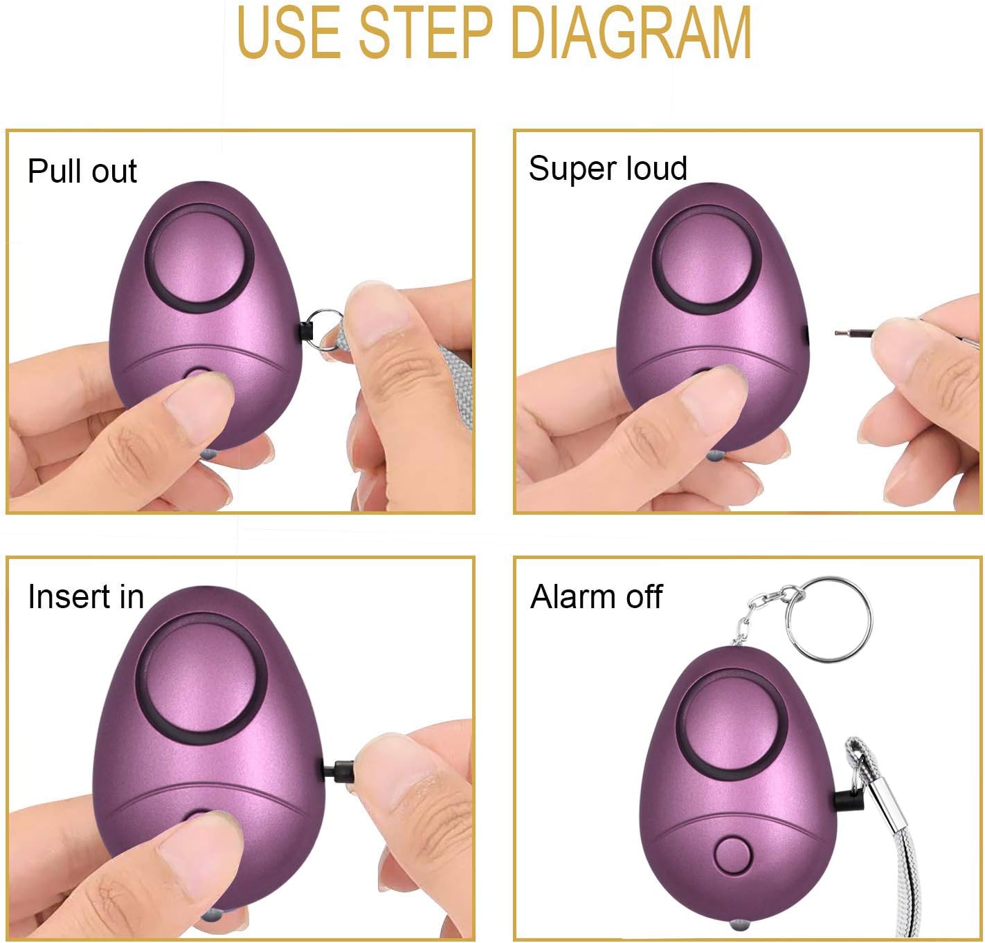 140db Safe Sound Personal Alarm: The emergency alarm can make a loud sound to draw attention to protect you from having an emergency even at distances as far as 606.9 ft. In addition, the sounds could last 50 minutes continuous ear-piercing alarm.
