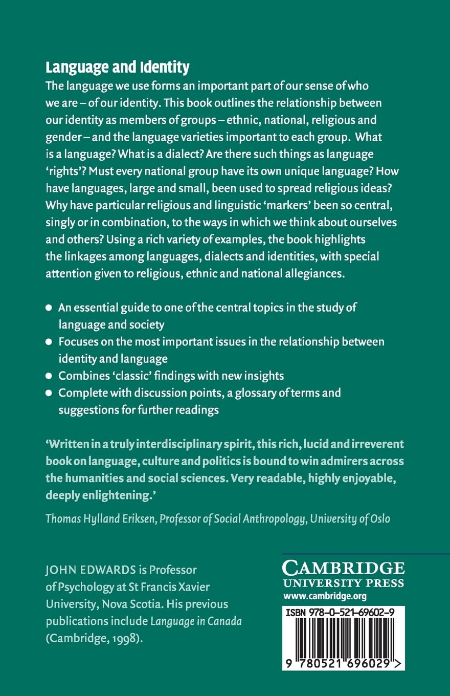 The language we use forms an important part of our sense of who we are – of our identity. This book outlines the relationship between our identity as members of groups – ethnic, national, religious and gender – and the language varieties important to each group. What is a language? What is a dialect? Are there such things as language ‘rights’? Must every national group have its own unique language? How have languages, large and small, been used to spread religious ideas? Why have particular religious and linguistic ‘markers’ been so central, singly or in combination, to the ways in which we think about ourselves and others? Using a rich variety of examples, the book highlights the linkages among languages, dialects and identities, with special attention given to religious, ethnic and national allegiances.