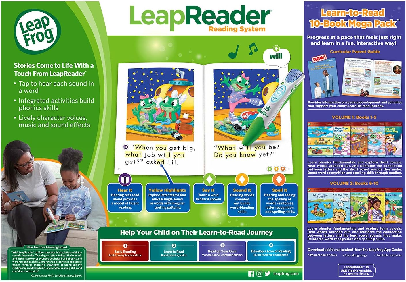 Includes: LeapReader system, built-in rechargeable battery, 10 Learn to Read books, and a downloadable digital content bundle