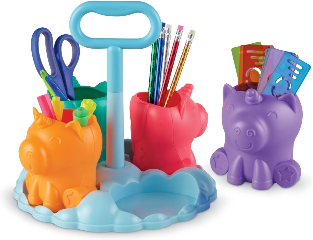 This friendly art supply organizer makes getting organized easy and fun! Kids learn early lessons in home and classroom organization every time they clean up with the mystical unicorns of the Create-a-Space Kiddy Center from Learning Resources. A younger take on our popular Create-a-Space organizational series, this caddy organizer adds a little bit of whimsy to classroom storage projects with the help of colorful character cups sized just right for little hands. Each art supplies organizer comes with four unicorn cups, with each one ready to act as pencil, scissor, glue stick, or crayon storage for kids. Each unicorn can be used with or without the rotating base, so you can tailor your organizational plans to fit your teaching supplies needs. If you need to take things on the go, the Create-a-Space Kiddy Center also comes with a durable easy-carry handle, whose intuitive design makes carrying this school supplies organizer from one spot to the next both simple and comfortable. Plus, their whimsical design makes them great additions to teacher décor and classroom themes! Toys from Learning Resources are at home in the classroom—for four decades, our award-winning educational toys and teacher resources have helped generations of students learn, play, and grow. Whether they’re helping teachers get organized or helping students grasp new concepts, our classroom supplies bring learning to life through hands-on, screen-free play. Made from durable, BPA-free plastic, our classroom toys and tools are ready for years of learning fun. We’re Learning Resources, and we’ve been helping parents and teachers build generations of amazing kids since 1984. From ABCs and 123s to fine motor and STEM skills, our educational toys offer kids the building blocks they need to succeed in school and develop a lifelong love of learning. Discover countless ways to learn through play with our award-winning products, including Toy of the Year winners Tumble Trax, Botley the Coding Robot, and Coding Critters. Learn more about how we turn a childhood love of play into a lifelong love of learning with a visit to our brand store today.