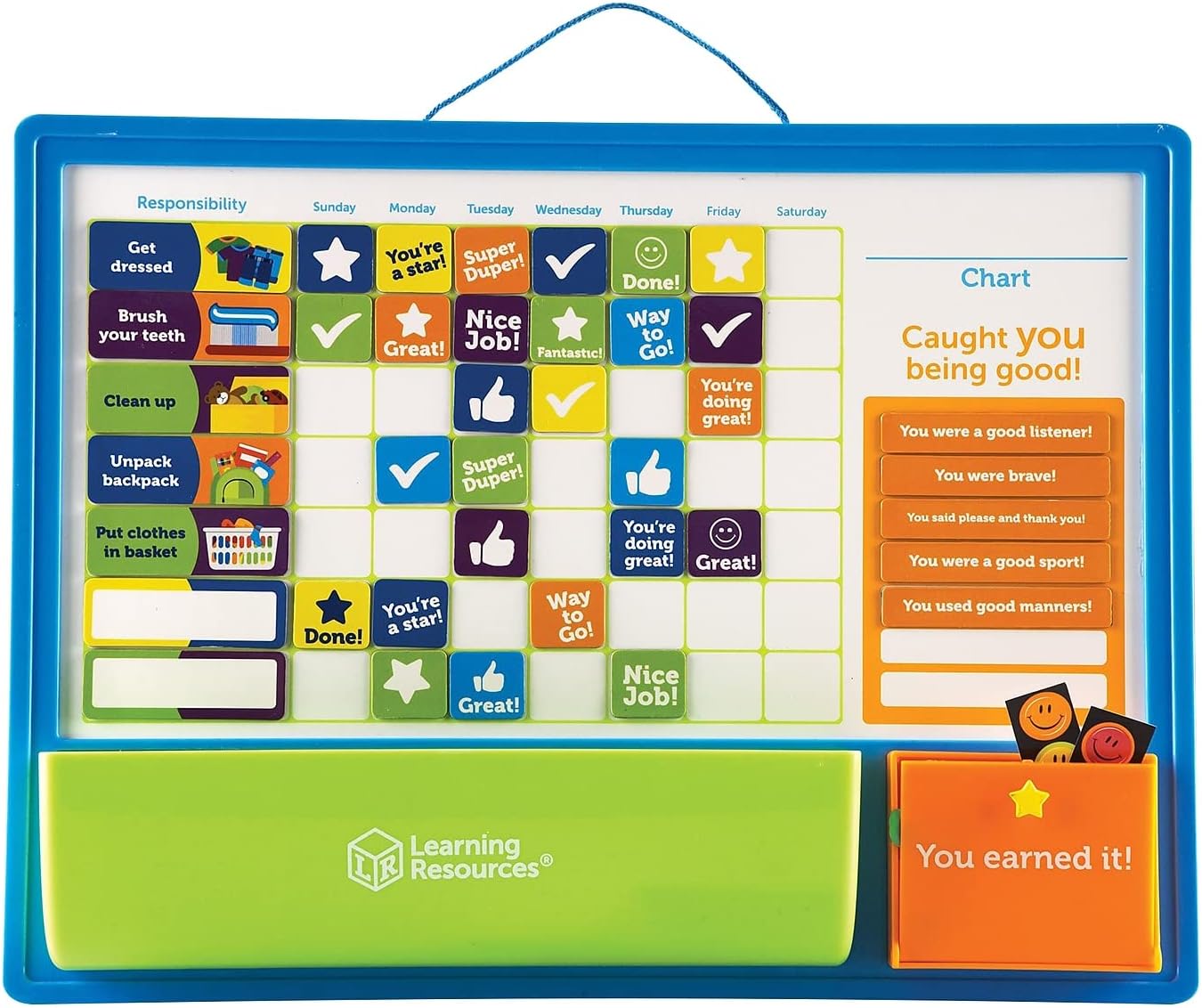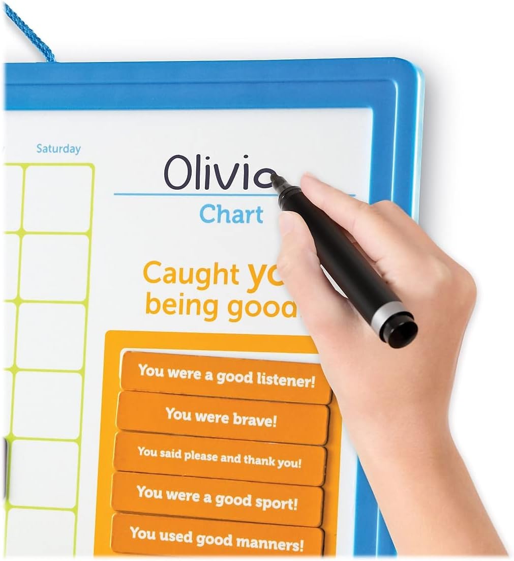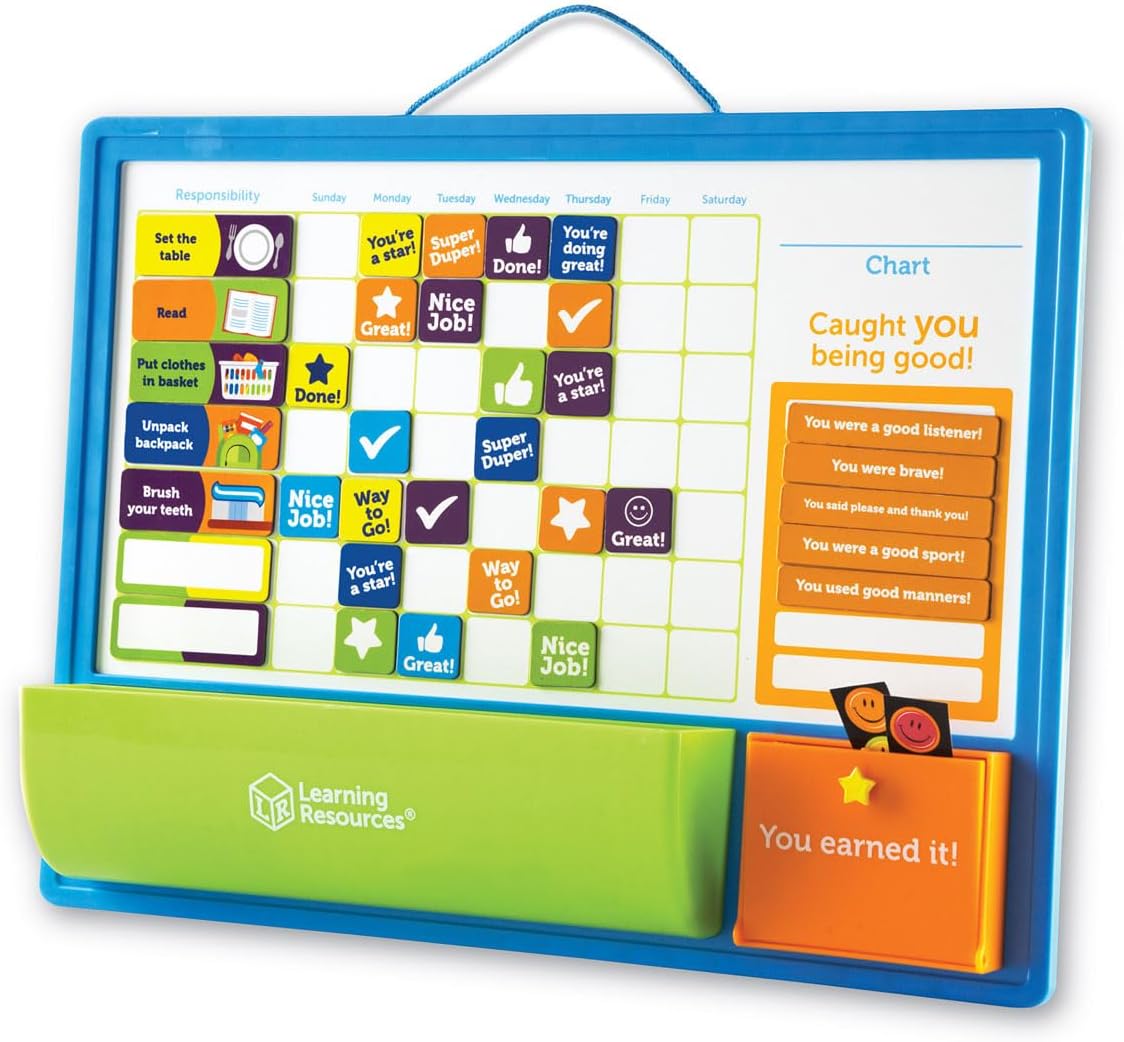 Now parents have the tools to help raise more responsible, self-reliant kids while supporting goal setting and good behavior. This magnetic responsibility chart encourages kids to develop, track, and earn rewards for their good behaviors with the good job reward chart from Learning Resources. This magnetic responsibility chart is durable and customizable with magnetic tiles and stickers corresponding to common household tasks, from “make the bed” and “help with dinner” to “do homework” and “brush your teeth.” Kids and parents may track daily progress when they choose a task (or customize one with blank stickers included). Parents may add an incentive and reward positive progress with accomplishment magnets, small toys and treats in the chart’s fun reward box. Kids may also earn their rewards through good behavior that’s unrelated to chores. The good behavior reward chart makes a great gift! The “caught you being good!” section gives parents space to recognize and celebrate moments of sweetness with magnets and stickers complete with affirmation-filled phrases.