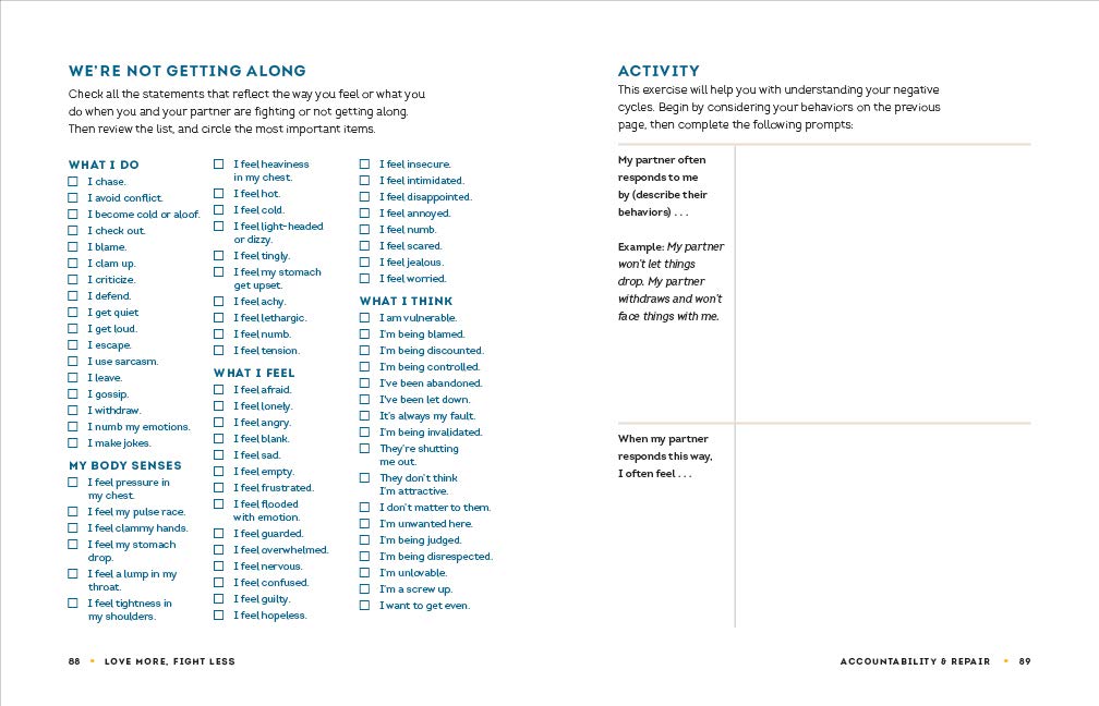 This relationship workbook is for couples who want to learn new skills and build a solid foundation for working through conflicts and moving forward in ways that strengthen their bonds.
