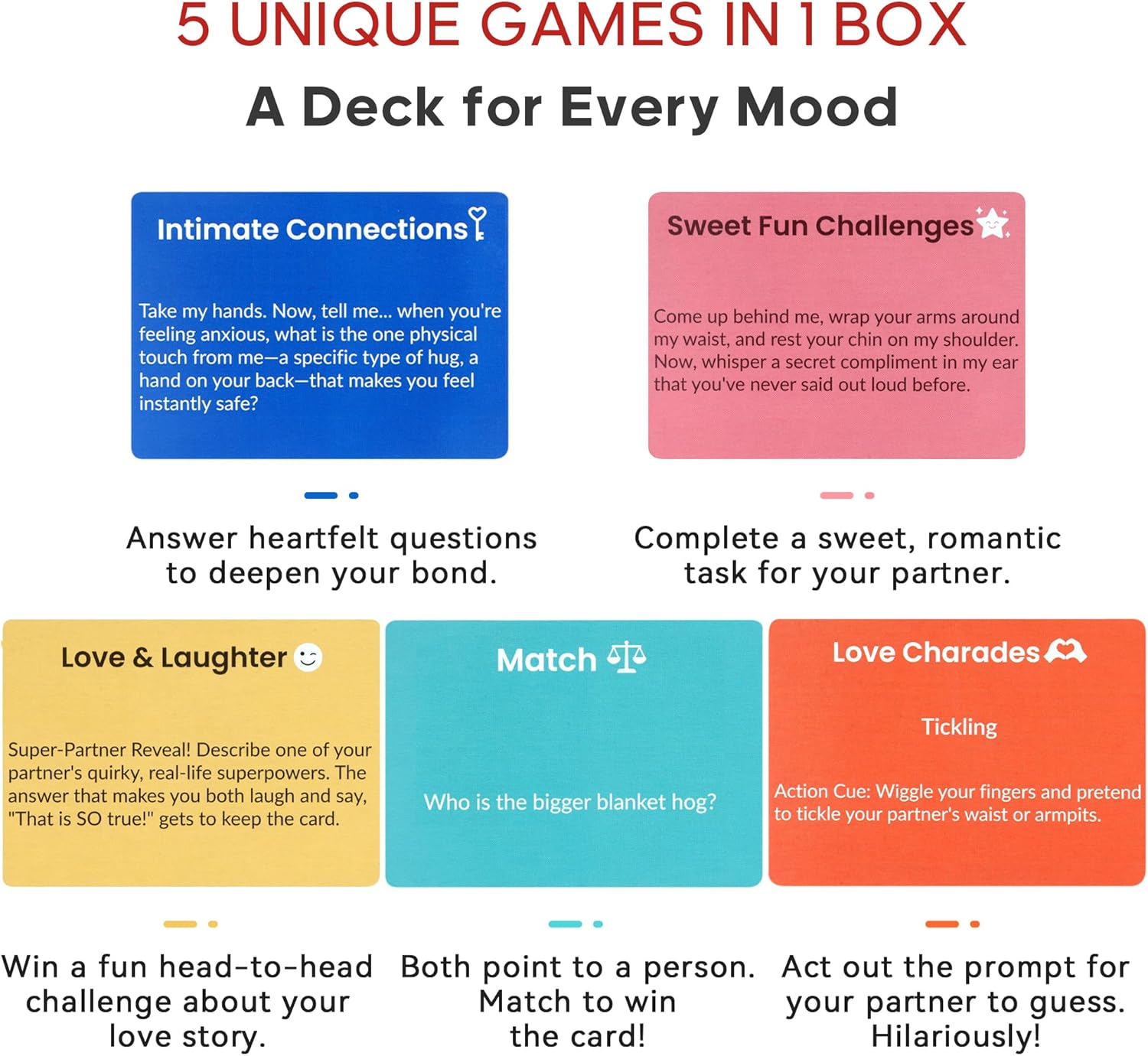 5 GAMES IN 1 FOR ENDLESS VARIETY ►Banish boring nights! Our date night game box delivers five unique decks—blending deep conversation with playful fun. Explore five exciting themes: Intimate Connections Sweet Fun Challenges Love & Laughter Match & Love Charades. Instantly switch your vibe for a fresh adventure every time—it’s like getting five couples card games for adults in one! Perfect for any date night games for couples who love laughter, connection, and surprises.