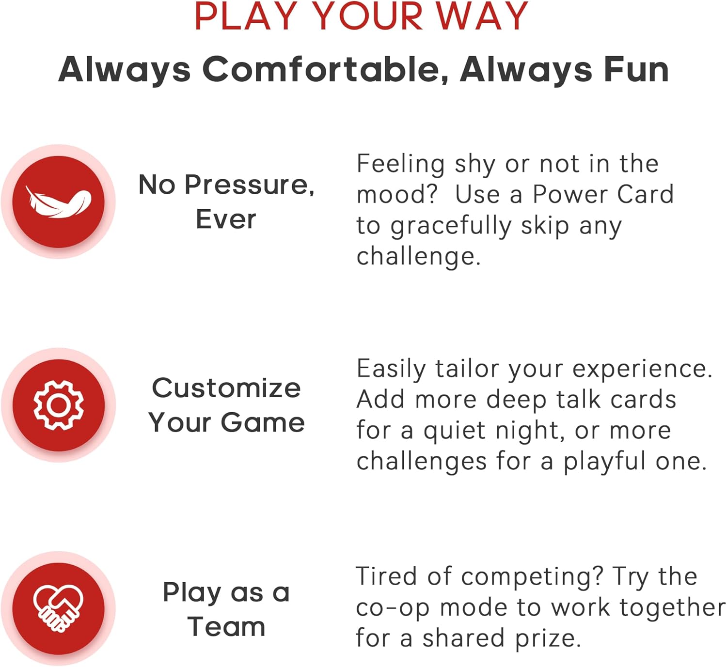 Inside this box, every card is an invitation to laugh more, listen deeper, and love better. We designed this relationship card game to help you put your phones away and put each other first!