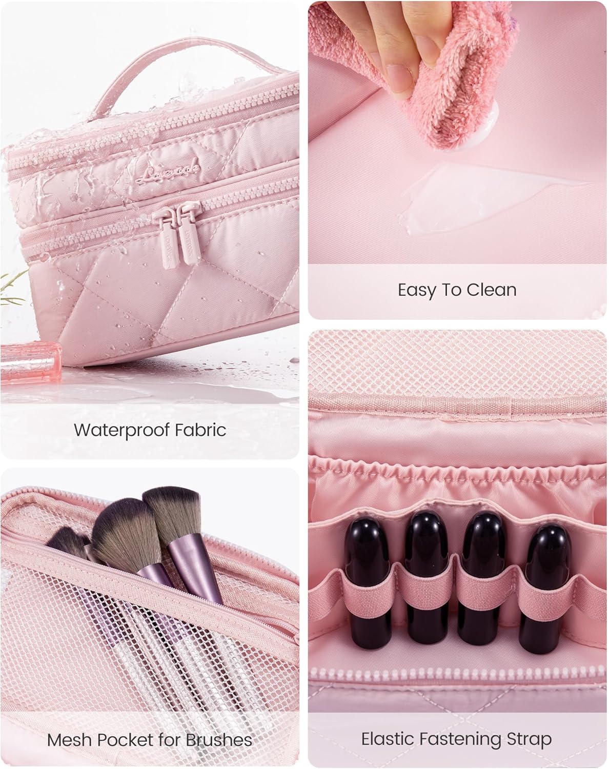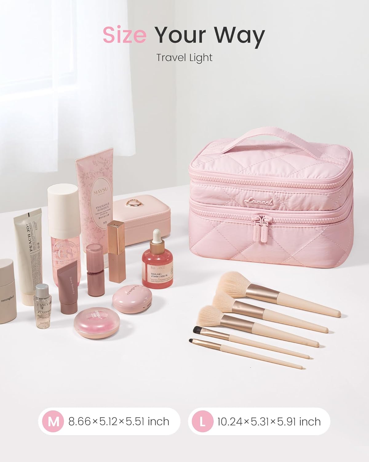LOVEVOOK Travel Makeup Bag,Large Open Flat Tolietry Bag for Women,Waterproof Portable Cosmetic Pouch,Double Layer Quilted Makeup Bag Organizer With Handle,Travel Essentials,Gift for Her