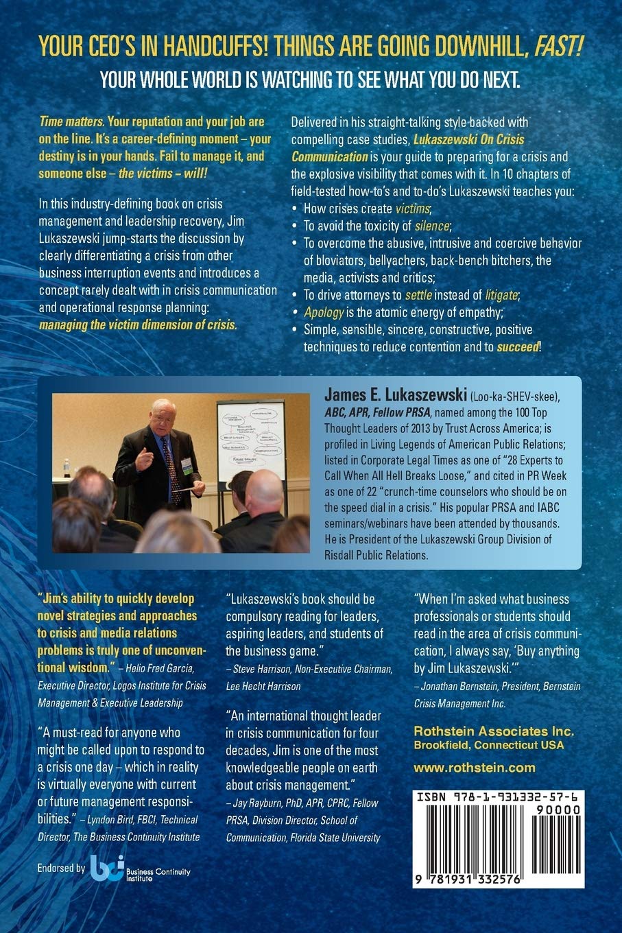 Crisis is not like other business interruptions. In a crisis, your company spokespersons, managers, and employees must know exactly what to do, what to say, when to say it, and when to do it — while the whole world is watching! But can you depend on your crisis management plan to make that happen? Lukaszewski on Crisis Communication is your guide to preparing for a crisis and the explosive visibility and reputation risk that come with it. In a masterful book selected as one of “30 Best Business Books of 2013” by Soundview Executive Book Summaries and endorsed by the Business Continuity Institute, Lukaszewski distills four decades of public relations experience into 10 chapters of field-tested advice. Delivered in his straight-talking style and backed with compelling case studies, examples and templates, Lukaszewski explains how to build a crisis management plan and how to put it into action in the real world of media scrutiny, social media, activists, and litigation. How-to’s, practical tools, tips, charts, checklists, forms, and templates teach you the simple, sensible, sincere, constructive, positive techniques to reduce contention and to succeed. His key messages teach you: To recognize how a crisis creates victims a topic rarely covered in traditional communications and operation response planning. To avoid the toxicity of silence. To overcome the abusive, intrusive, and coercive behavior of the media, activists, and critics what he calls the bloviators, bellyachers, back-bench bitchers. To drive attorneys to settle instead of litigate. To use the value of an apology, the atomic energy of empathy. Thought-provoking discussion questions, real-life case studies and examples, comprehensive index, and detailed glossary facilitate both college and professional instruction. Downloadable resources and tools Access a practical toolkit full of innovative and field-tested plans, forms, checklists, tips, and tools to support you as you prepare your organization for effective crisis communication./ Instructional Materials For the classroom, an Instructor s Manual available for use by approved adopters in college courses and professional development training. Also, to assist in instruction, the author makes available his slides, videos, and Skype interaction.