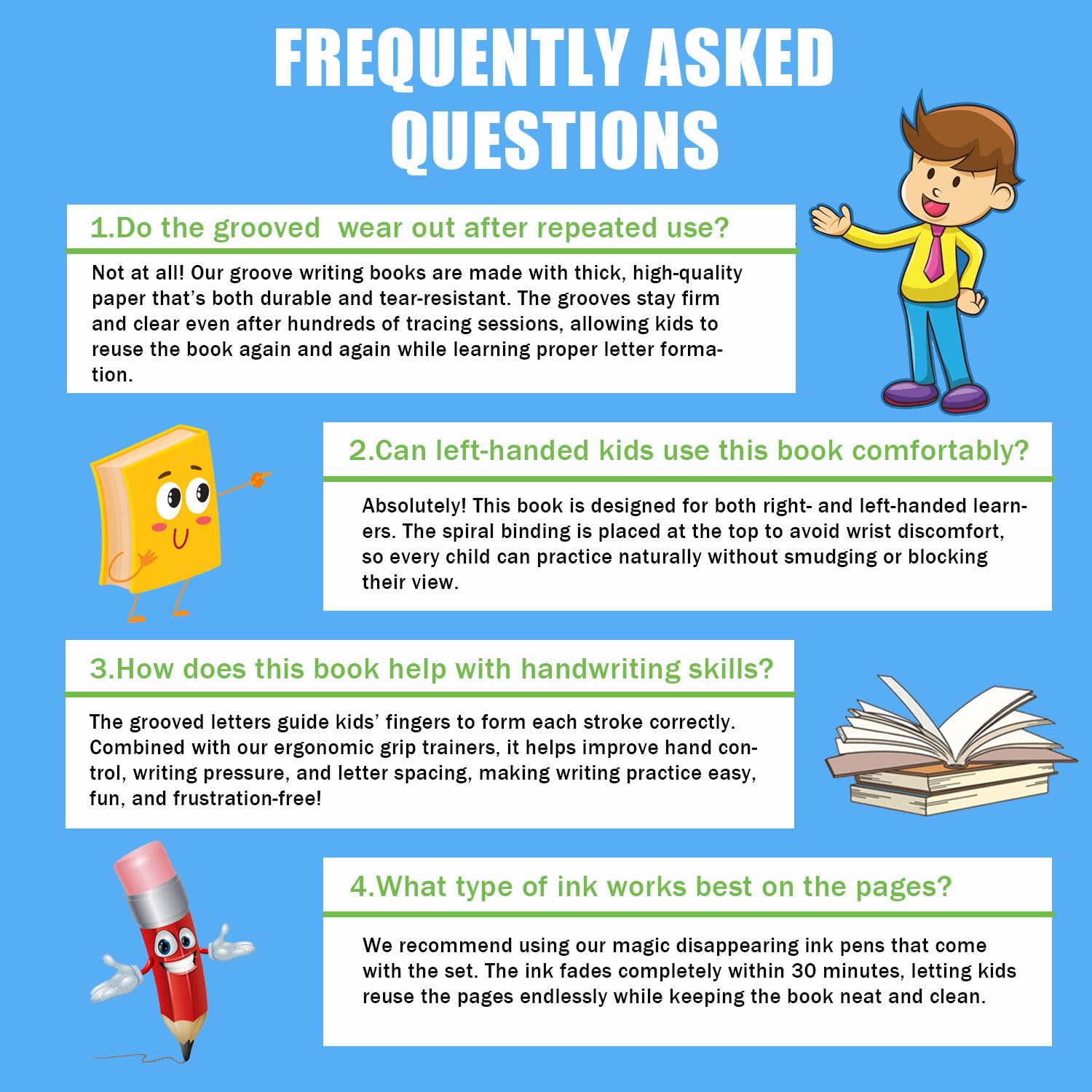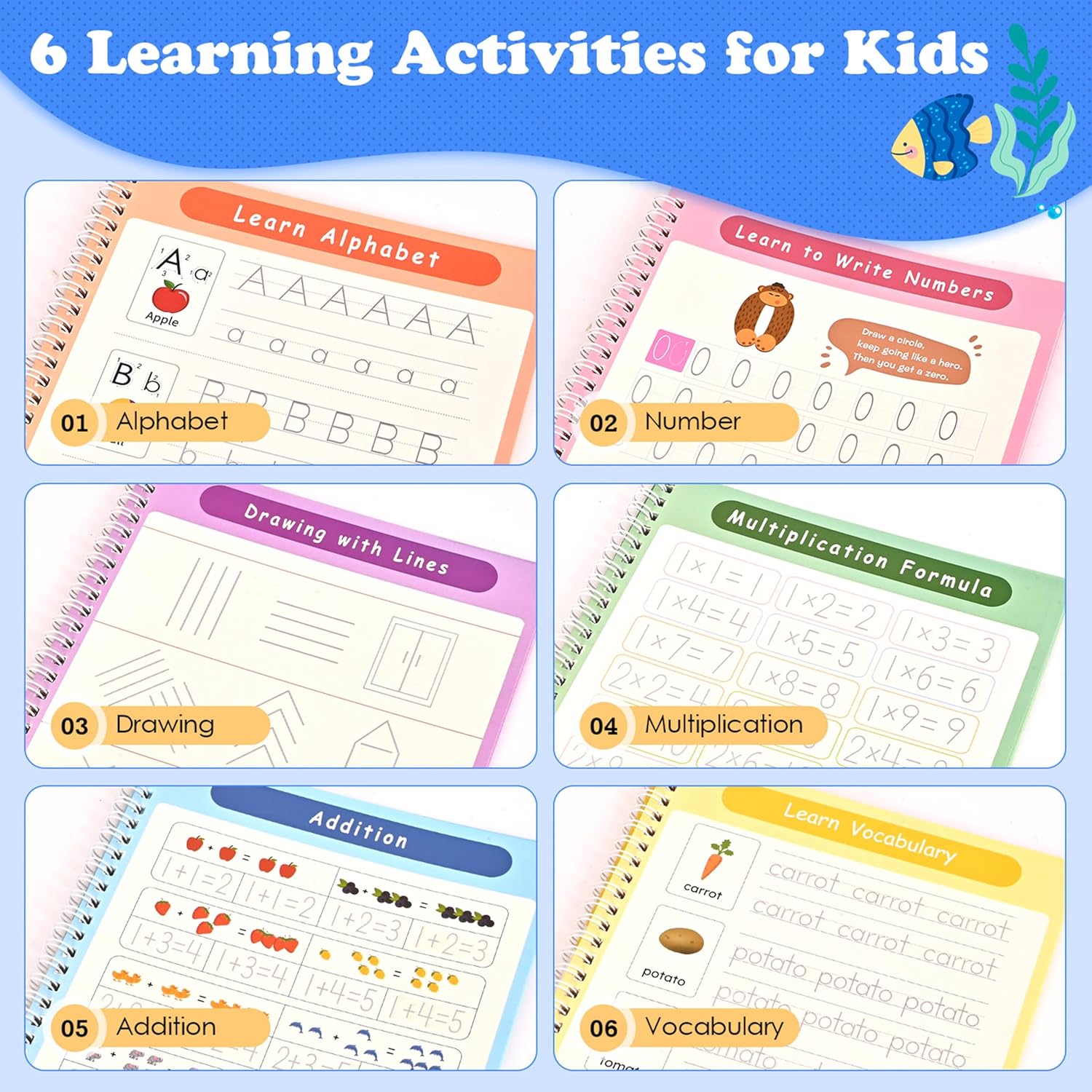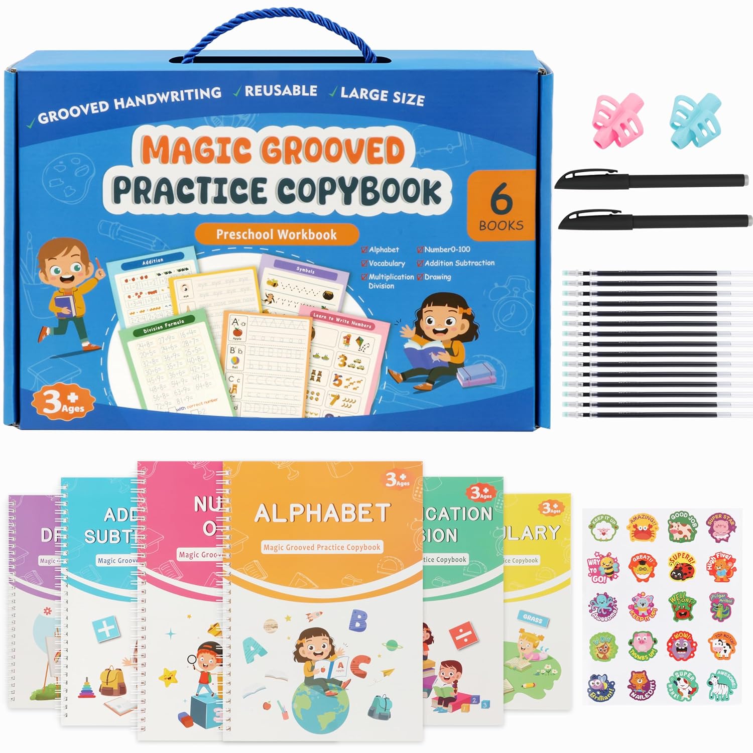 Upgraded Handwriting Practice Kit:Our magic grooved writing practice set includes 6 childrens books, 2 magic pens, 15 refills, 2 pen grips, and 1 reward sticker sheet. Children can practice letters, numbers, words, addition, subtraction, multiplication, division, vocabulary, drawing, and basic writing skills across 6 themed busy books. Fun, engaging, and screen-free—this set is the ideal early learning tool for boys and girls ages 3–8 at home or school.