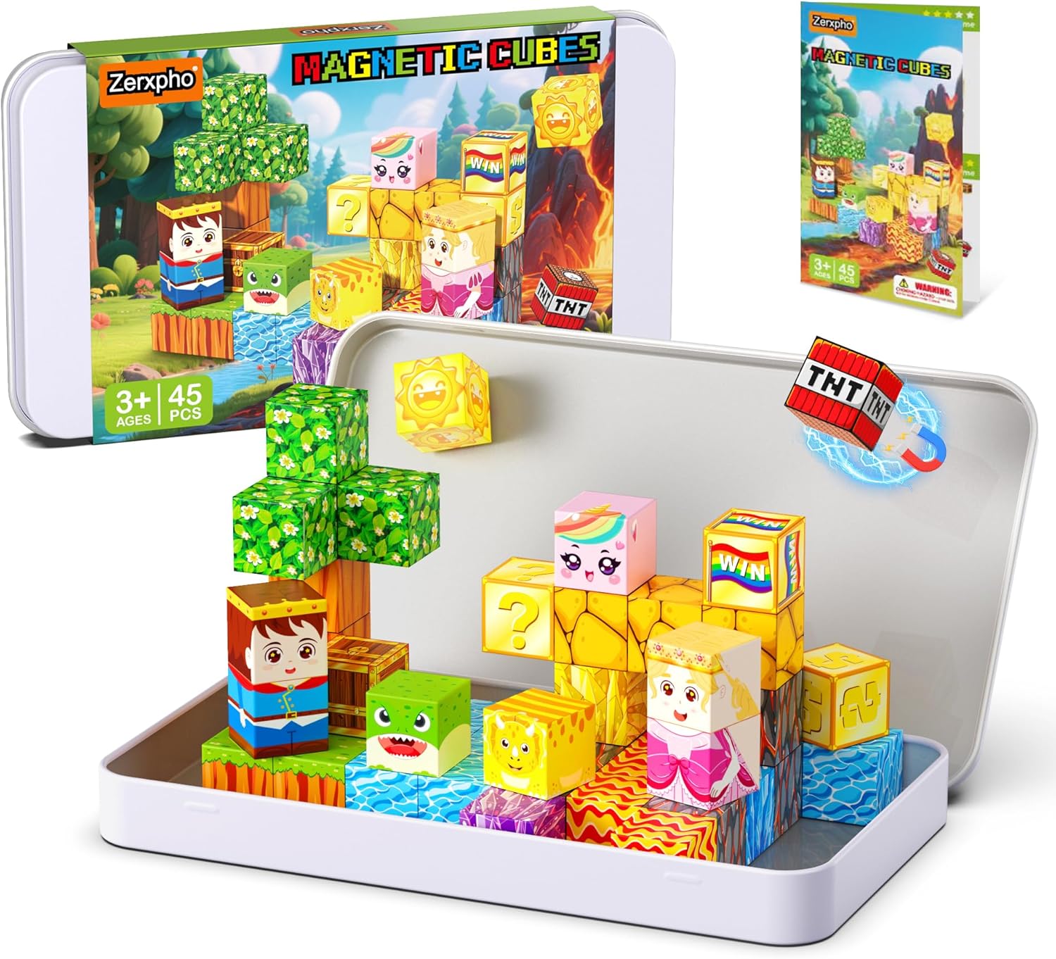 Mini Magnetic Blocks: This 45-piece magnetic block travel set comes in a portable case, making it easy to carry and tidy up quickly. The high-quality metal box also functions as a play base. It keeps children happily engaged during travel, whether in cars, on airplanes, or at restaurants. The perfect companion for on-the-go fun.