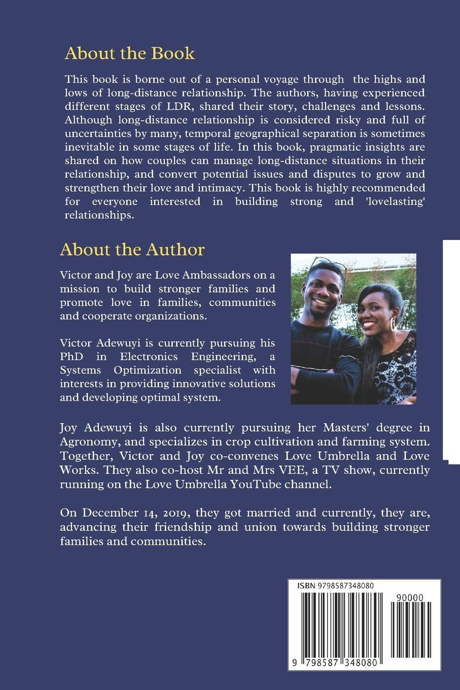 Many people repel long-distance love relationships for several reasons, one of which emanates from the popular cliché: ‘out of sight is out of mind’. The fears of uncertainties and concerns about the low likelihood of success long-distance relationships are further amplified by tales of heartbreaks or unpleasant experiences shared by couples in long-distance relationships. Although it is advisable that couples guide against long-distance separation in their relationship, the demands of life sometimes present situations where temporal geographical separations become inevitable for couples. Hence, there is a need to help couples overcome setbacks and other challenges associated with long distance, and equip them with pragmatic principles and strategies to grow in love and intimacy while going through such phases. Having personally encountered the highs and lows of long-distance relationship, our goal is to help other long-distance relationship couples to ‘stay in mind while they are temporarily out of sight’. This book is directed at helping couples in long-distance relationships to successfully navigate the hurdles and challenges peculiar to the journey.Many people think that love is all that matters. We thought so too, but realized along the path that although love is important, love is helpless when it lacks the requisite knowledge. Love without knowledge is helpless.Just like a plant obtains its nourishment for survival and sustenance, relationships too need nourishment. Many relationships, which started with promising hopes and great energy, started declining and withering when long-distance sets in. This is a common case of many great friendships that started off on campus, but gradually collapsed after graduation. Our long-distance relationship (LDR) experience has taught us that a good relationship, either long-distance or short, needs some essential elements, of which understanding is also non-negotiable. I usually tease my wife that our courtship qualifies for a certificate degree in Long-Distance Relationship (LDR). First, it was a four-year long courtship (not the longest out there though), and was long-distance for the most part. As you would discover in the course of this book, about 90% of our courtship period was long-distance. My first proposal to Joy was done over a phone call and a follow-up love letter (email actually), and our traditional wedding was done on Skype because we were on different continents when the time was ripe for the wedding. Despite the ups and downs and the emotional hysteresis in our long-distance relationship, we sailed successfully and anchored our ship at the conjugal bliss border on the fourth year of courtship.