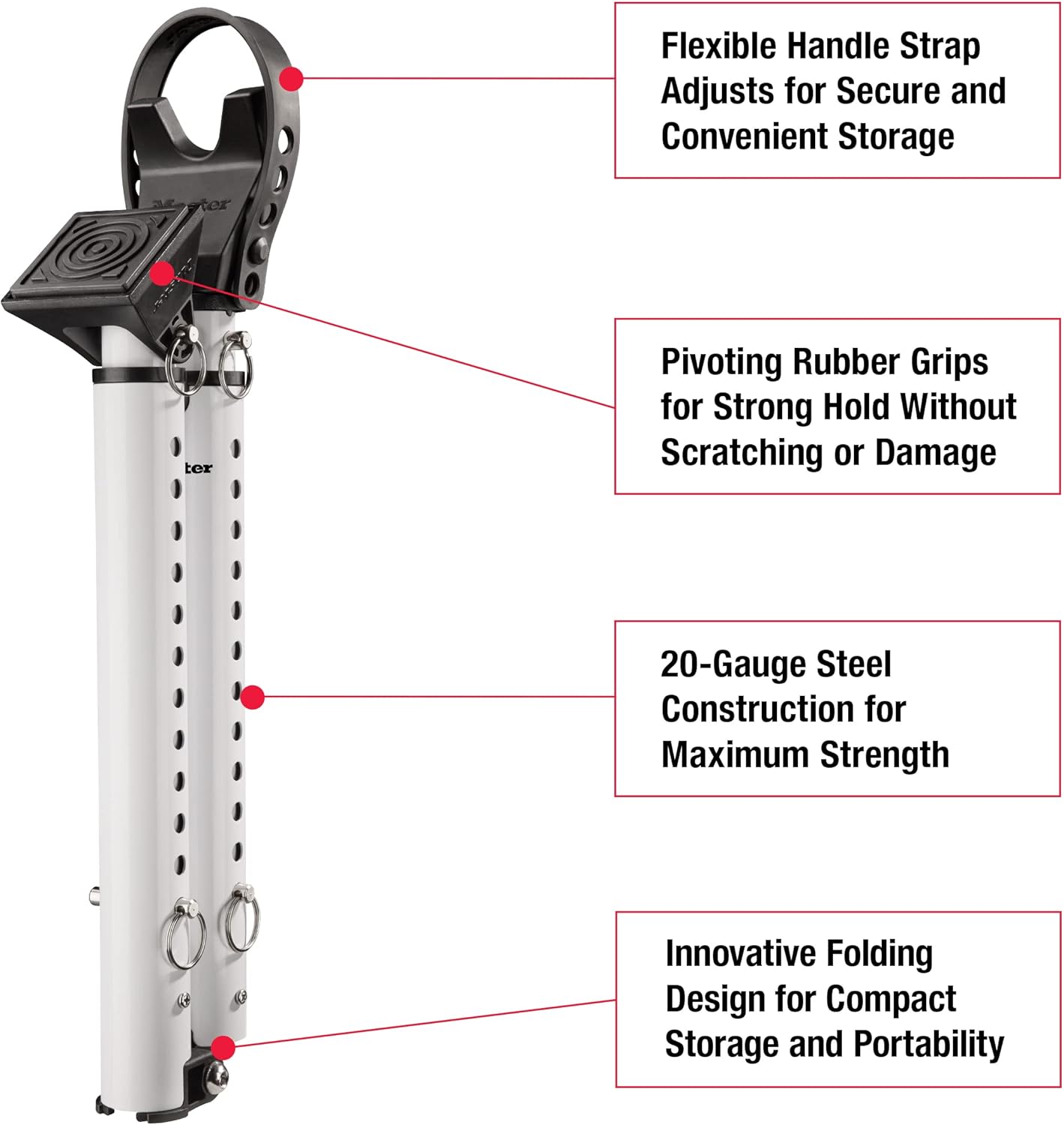 Made with heavy duty 20-gauge steel for strength and security; Pivoting rubber grips ensure strong hold without scratching or damaging doors and floors