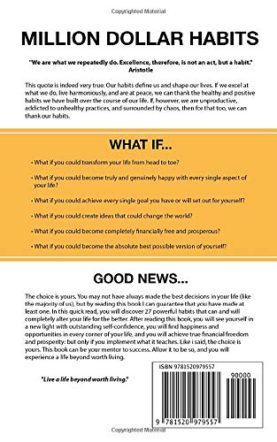 What if…What if you could transform yourself from head to toe?What if you could achieve success within every single aspect of your life: relationships, family, business, health?What if you could reach all of your goals, and achieve true and profound happiness?What if you could create ideas that could change the world?What if you could become completely financially free and prosperous?What if you could become the absolute best possible version of yourself?Good News…The choice is yours. You may not have always made the best decisions in your life (like the majority of us), but by reading this book I can guarantee that you have made at least one. In this quick read, you will discover 27 powerful habits that can and will completely alter your life for the better. After reading this book, you will see yourself in a new light with outstanding self-confidence, you will find happiness and opportunities in every corner of your life, and you will achieve true financial freedom and prosperity: but only if you implement what it teaches into every aspect of your life. Like i said, the choice is yours. This book can be your mentor to success. Allow it to be so, and you will experience a life beyond worth living. In this book you will learn…How to utilize the life-changing power of habit to your complete advantageHow to construct a success driven mentalityHow to become genuinely happy in all aspects of yourself and your lifeHow to create powerful and unique ideas that can change the worldHow to curate and nurture a “Millionaire’s Mindset”How to achieve and create financial success and abundanceAnd lastly, but most importantly, how to become the best possible version of yourself