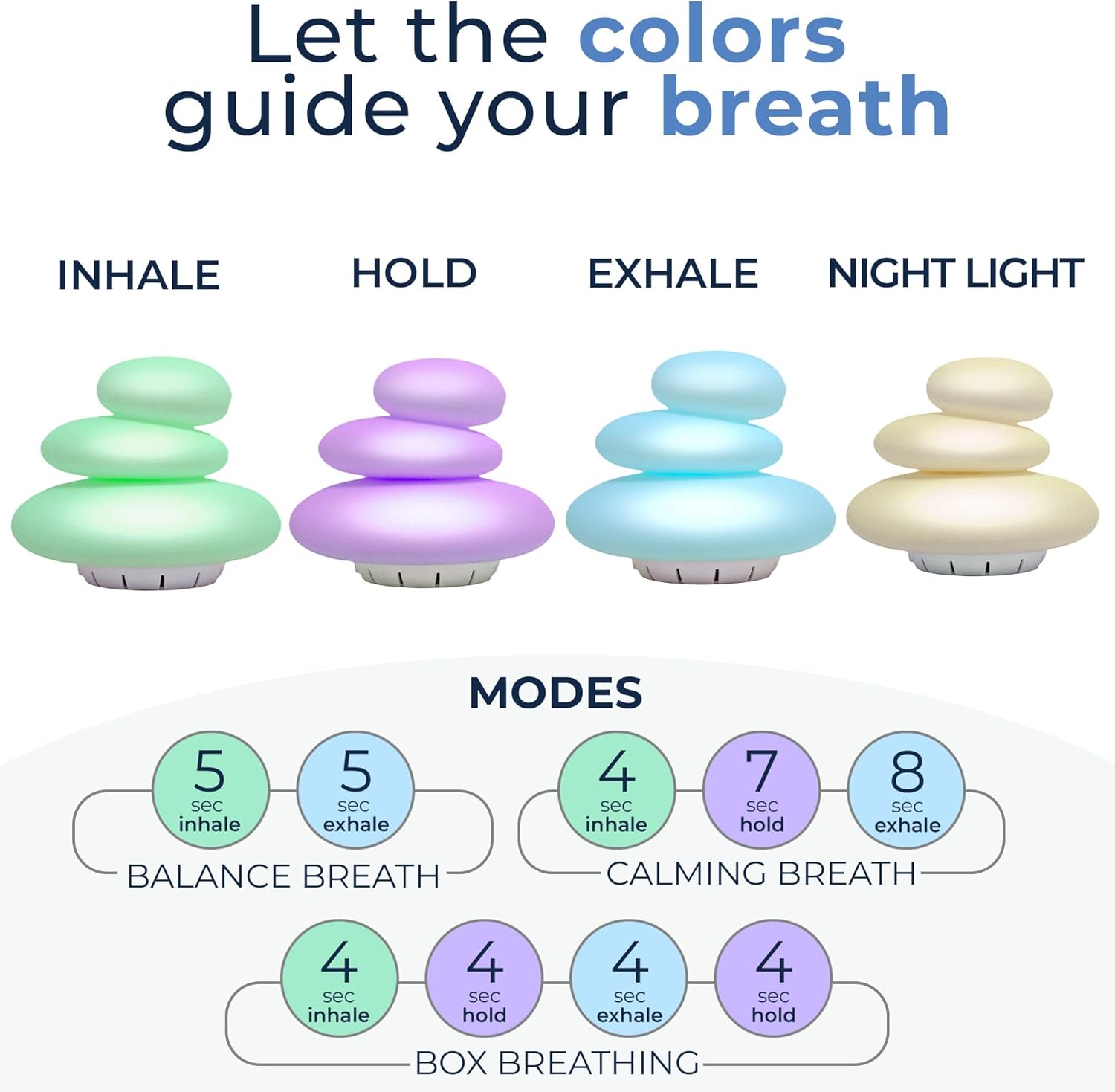 🧠 HOW TO USE IT – the same 3 easy to use breathing modes OR as a calming night light. Simply follow fade-in, fade-out color prompts that simulate the popular 4/7/8 ‘calming breath’, 5/5 ‘balance breath’, or 4/4/4/4 ‘box breathing’. Green Buddha – Inhale , Purple Buddha – Hold, Blue Buddha – Exhale. Lightly tap on surface to adjust brightness. Use with or without sound.