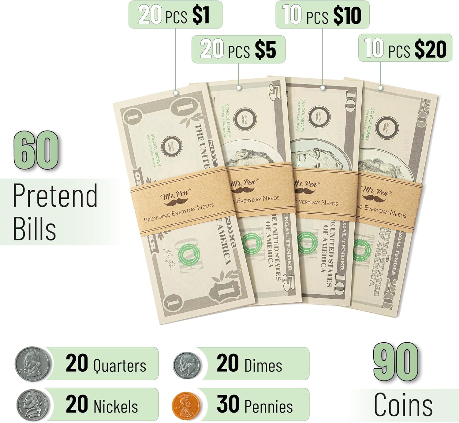 - Mr. Pen play money for kids consists of premium plastic coins and durable, heavy-duty paper with two-sided printed pretend money, designed for endless play transactions just like real American Dollars.