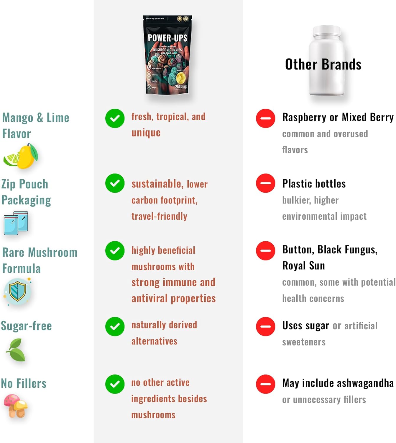 Power-Ups stand out with a unique flavor, a formula focused solely on functional mushrooms, zero sugar, and packaging designed to minimize environmental impact—offering clean, effective support without compromise.