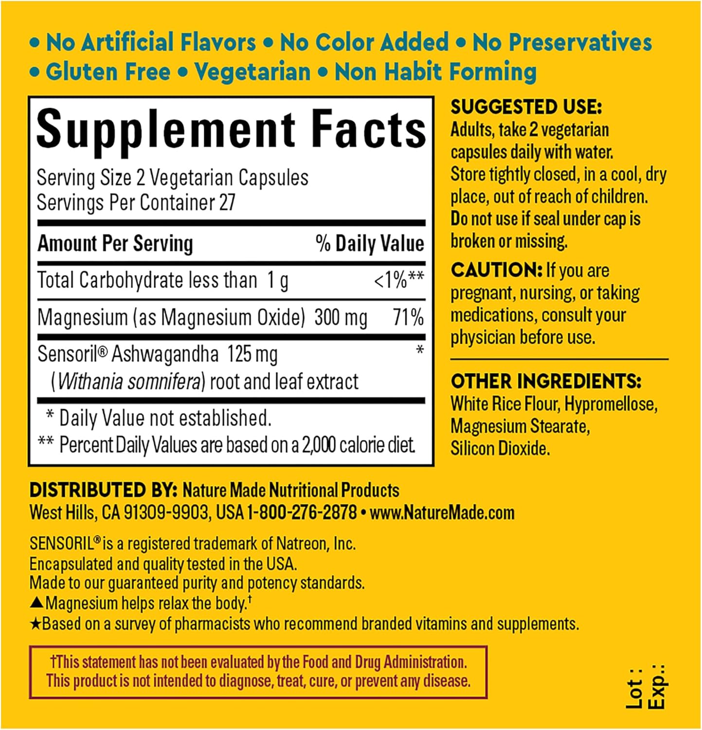 Wish you could relieve mind and body tension? Nature Made Wellblends Calm & Relax provides 2 benefits in 1 blend with clinically studied Ashwaganda to help reduce stress and Magnesium to help relax the body. The Ashwagandha herb is revered as an adaptogen to help support stress resilience. SENSORIL Ashwagandha is clinically studied to reduce both perceived stress and the stress hormone cortisol. Magnesium is an essential mineral that, among its many other roles, helps relax the body. Support ongoing stress with 2 daily vegetarian capsules that are gluten free and non habit forming with no artificial flavors, no preservatives and no color added. Adults, take 2 vegetarian capsules daily with water. This blend is ideal for adults seeking an Ashwagandha supplement in addition to a Magnesium supplement. Sensoril is a registered trademark of Natreon, Inc. (1)Ingredients powered by science (2)Ashwagandha is clinically studied to reduce stress *Based on a 2022 survey of pharmacists who recommend branded vitamins and supplements. These statements have not been evaluated by the Food and Drug Administration. This product is not intended to diagnose, treat, cure, or prevent any disease.