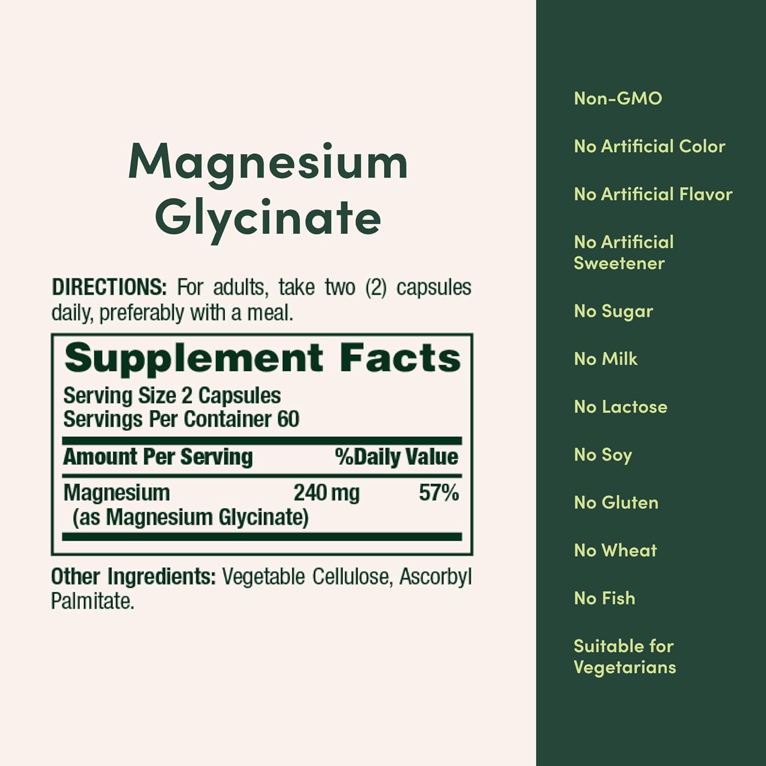 SUITABLE FOR MANY DIETARY PREFERENCES: Nature’s Bounty High Absorption Magnesium Glycinate is suitable for vegetarians; non-GMO; gluten-free; lactose-free; and contains no sugar; sodium; or artificial colors and sweeteners