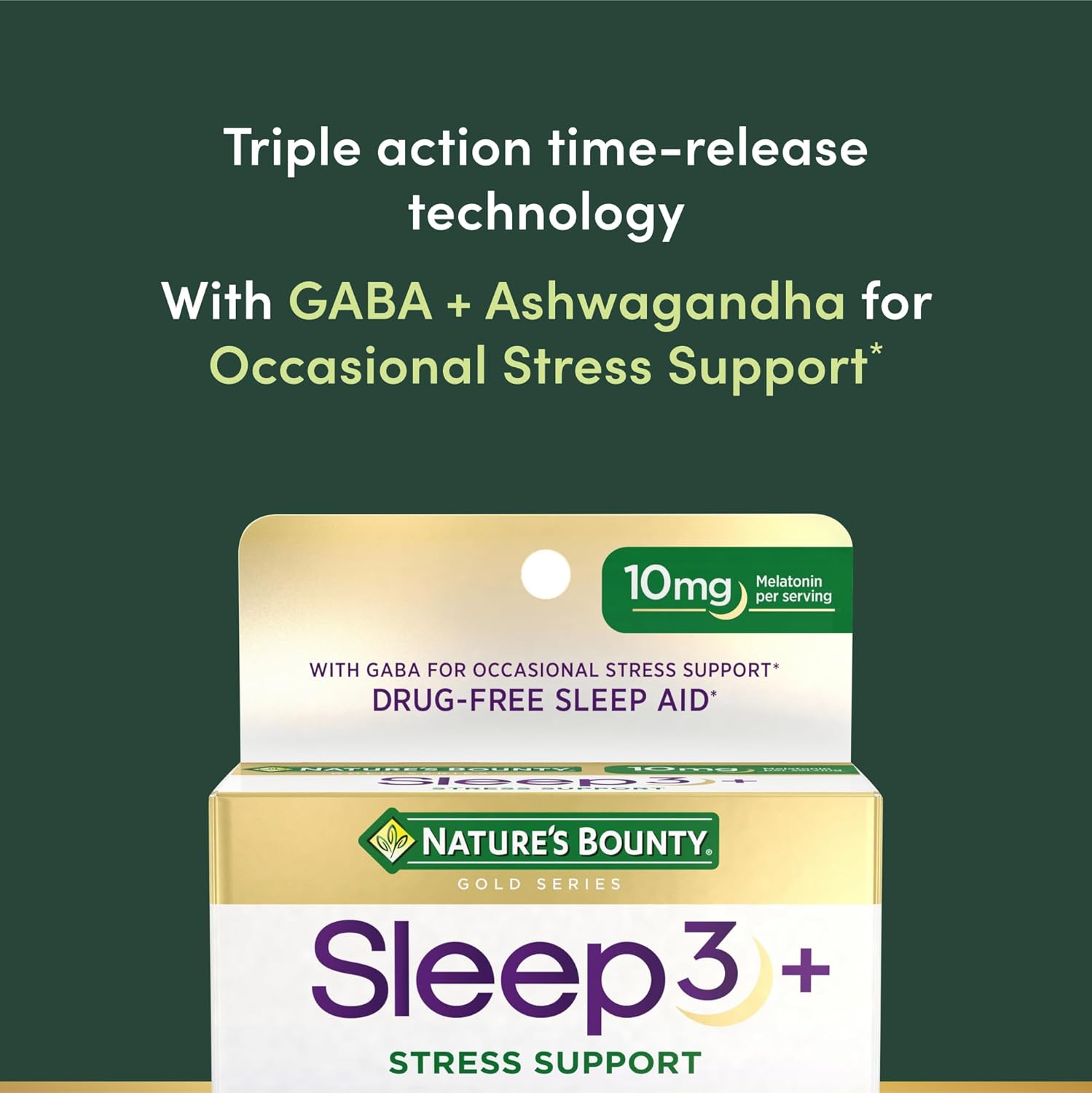 Style:56 Count Nature’s Bounty Sleep3+ Stress Support is the first and only maximum strength, tri-layer sleep and stress aid.* Using innovative time-release technology, each layer is dissolved at different times throughout the night to help you relax, de-stress, and get long-lasting sleep, especially when experiencing occasional sleeplessness.* The drug-free supplement contains two types of Melatonin, a sleep aid that plays a vital role in the maintenance of the circadian rhythm “sleep-wake-cycle”, sleep induction, and sleep duration.* With 10 mg of melatonin per serving, Nature’s Bounty Sleep3+ Stress Support offers quick release melatonin to help you fall asleep faster, and time-release melatonin to help you stay asleep longer by working with your body’s natural sleep cycle.* For additional stress support benefits, Nature’s Bounty Sleep3+ Stress Support also includes 100 mg of GABA, a stress aid, to help relax the mind and support occasional stress, plus 60g of Ashwagandha per serving. Just taking 1 tablet 30 minutes before bedtime can help you wake up feeling refreshed.*