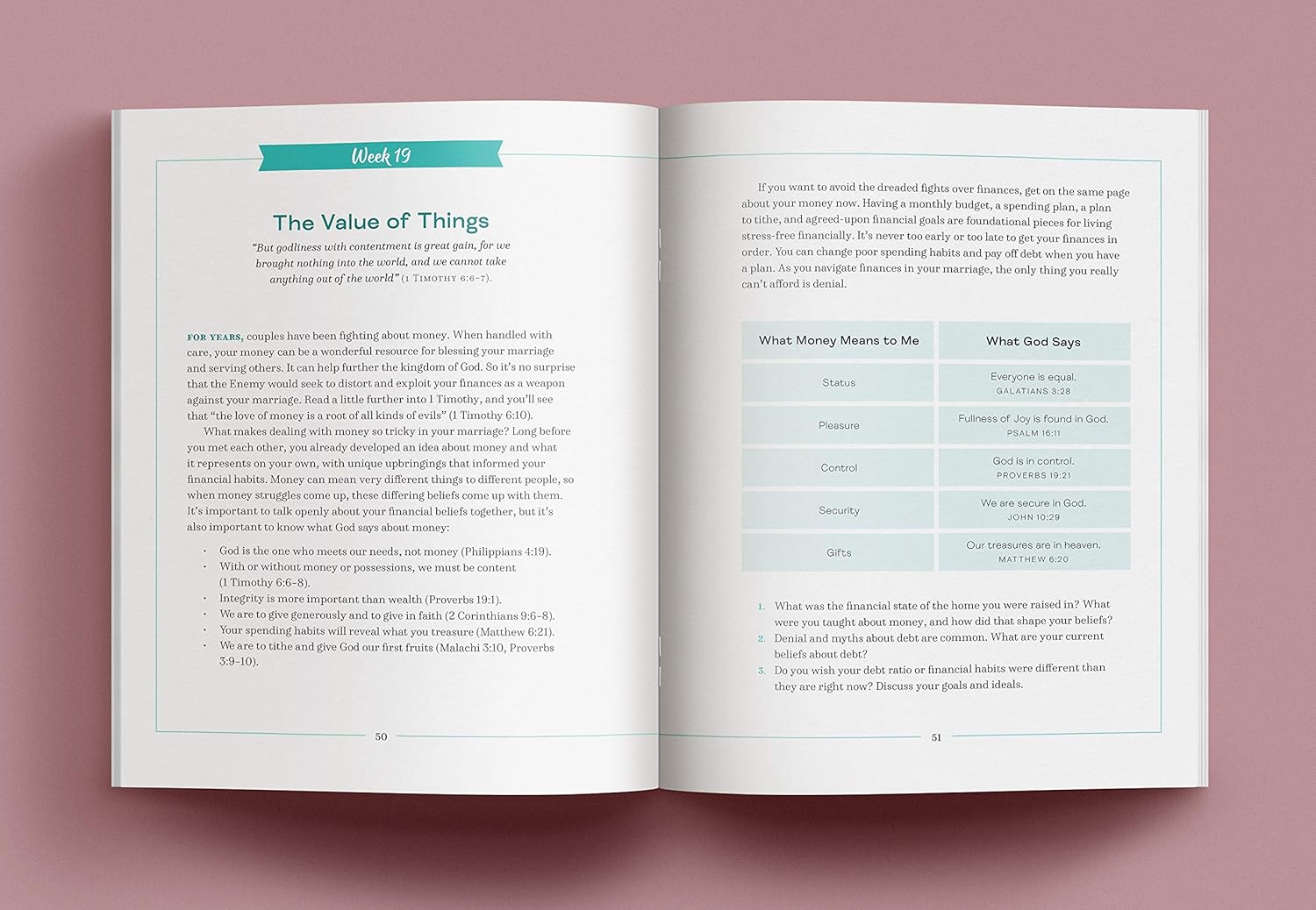 At the end, you’ll find a specific, everyday prayer relevant to that week’s topic, allowing you to ask God to help you apply his truth to your marriage.