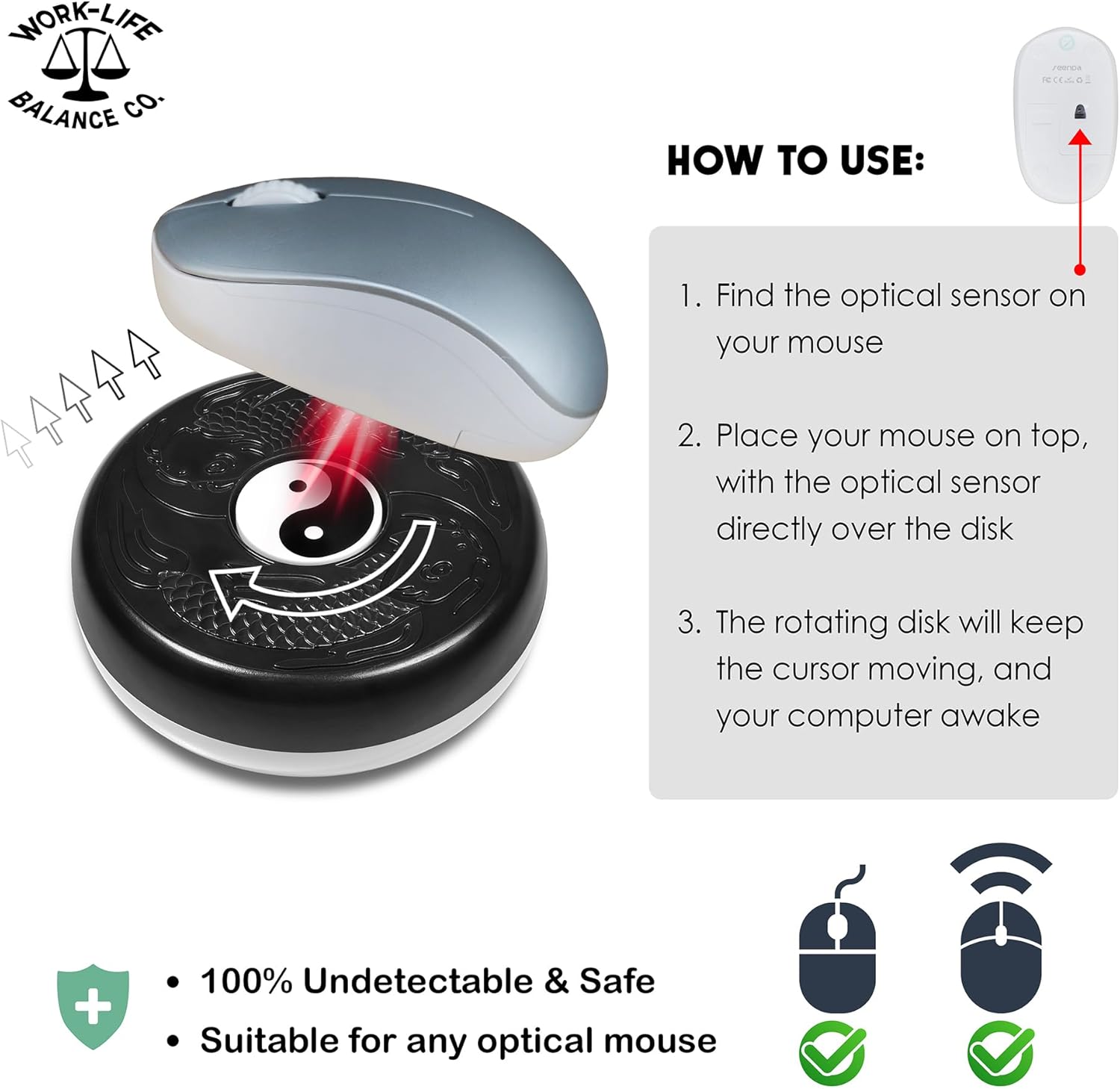 100% UNDETECTABLE: Free your time. No Software to install. Simulates physical mouse movement. No settings to mess with Undetectable by software. Does not require the use of key loggers, programs, or Bluetooth. Not detectable by hardware scans and company IT.