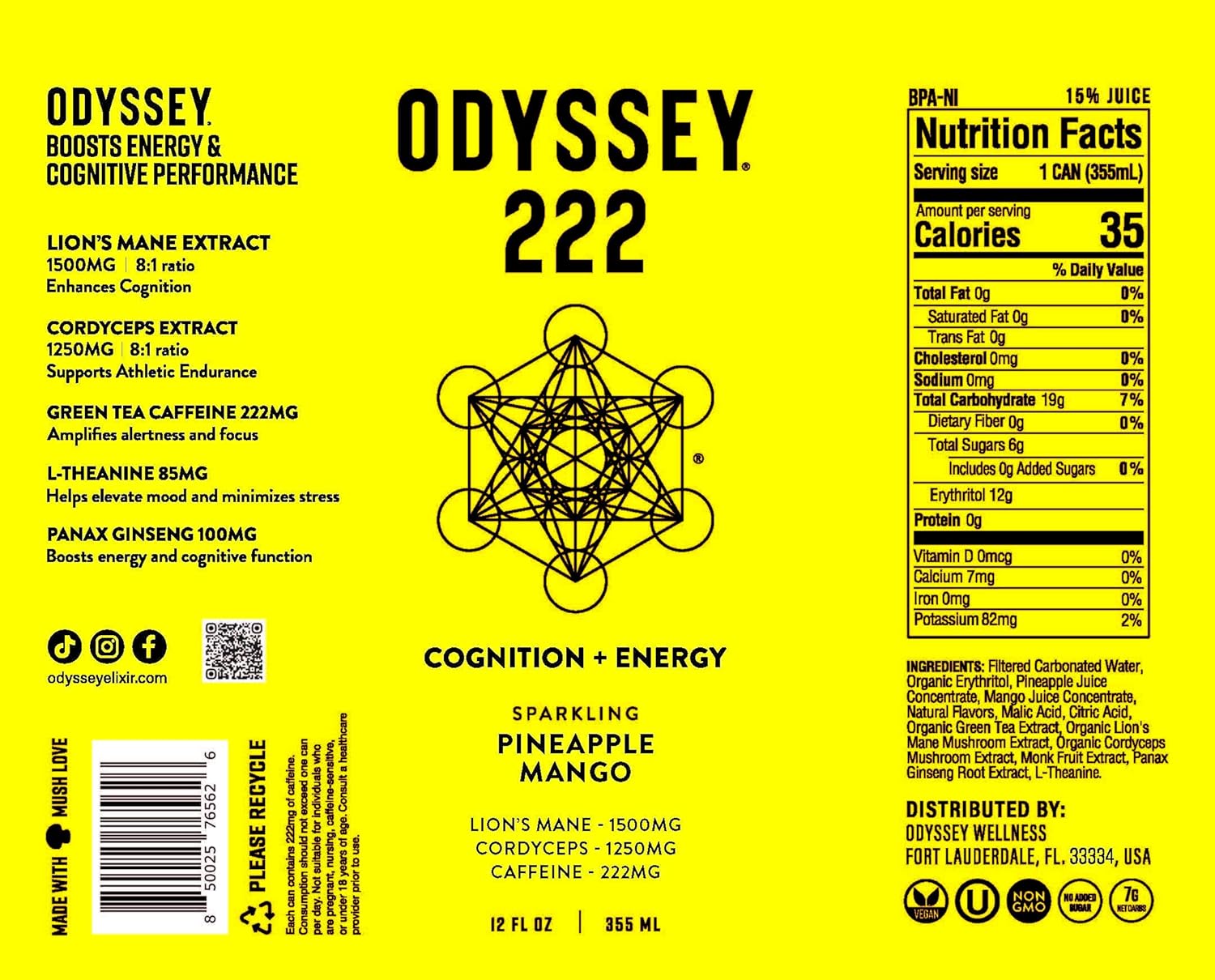 Odyssey Elixir – Odyssey 222 – Sparkling Energy Drink – 222 mg of Caffeine – Lion’s Mane & Cordyceps – Energy & Focus – Endurance & Stamina – Nootropic – Pre Workout – Pineapple Mango