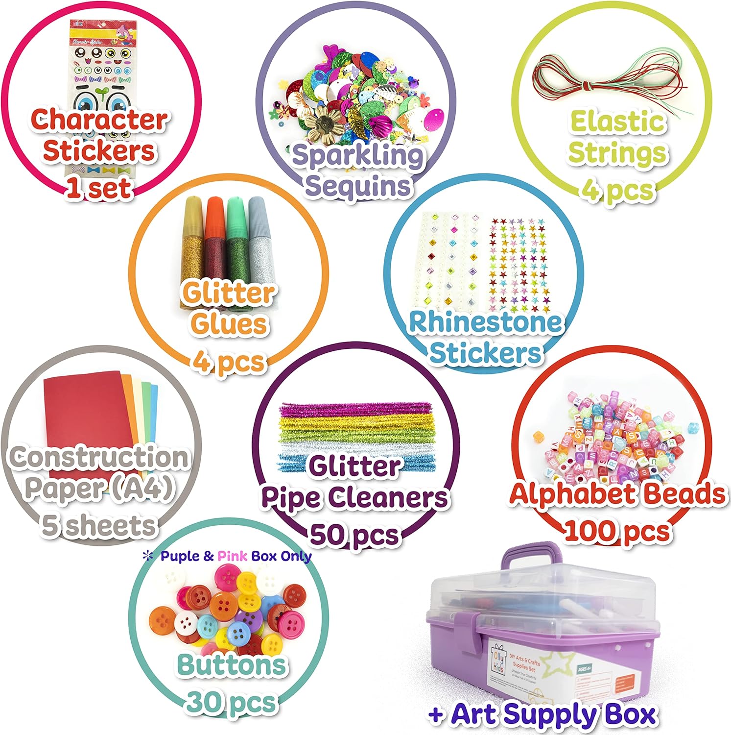 Olly Kids Arts and Crafts Supplies Set- 1000+ Pieces Giftable Craft Box for Kids: DIY Craft Supplies for Toddlers, School Project, and Homeschool