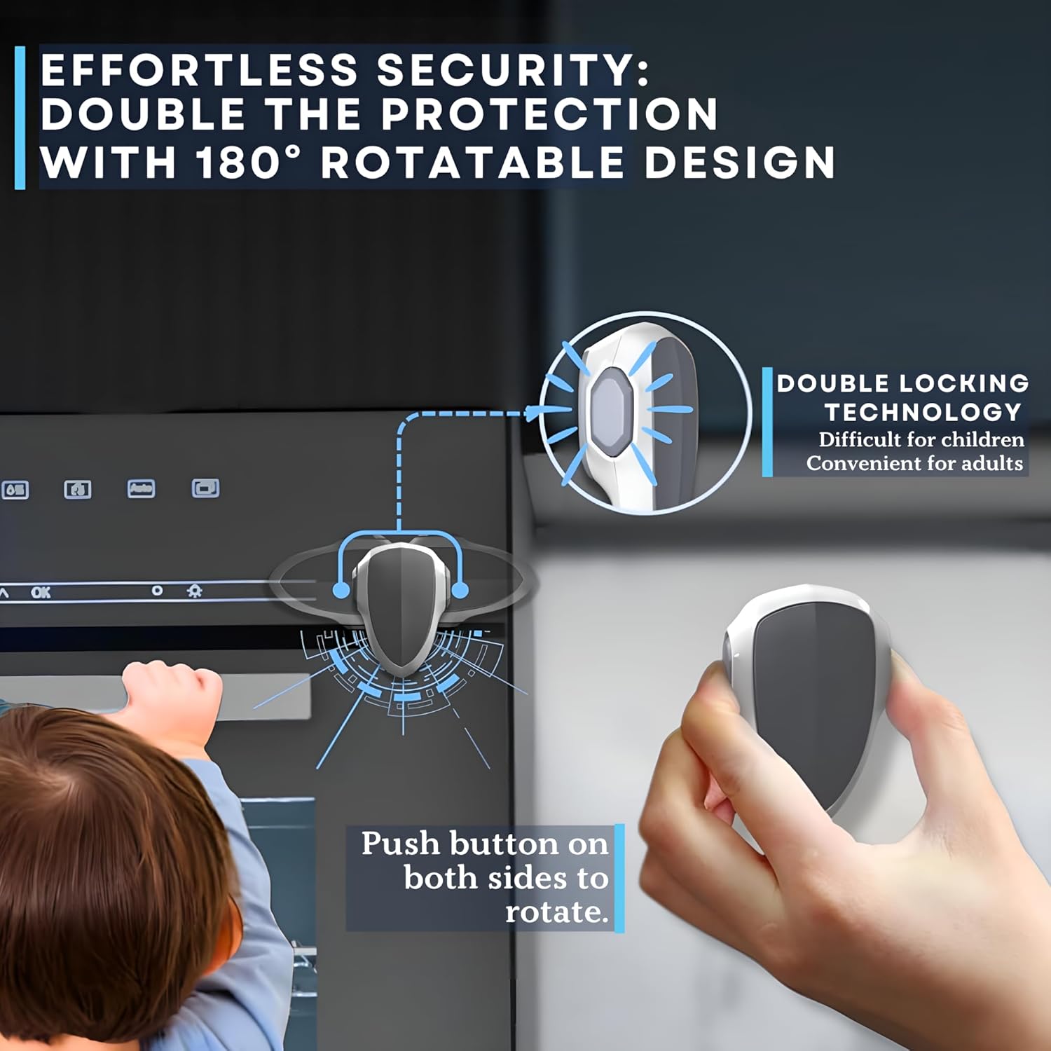 𝟏𝟖𝟎° 𝐒𝐖𝐈𝐕𝐄𝐋 & 𝐃𝐎𝐔𝐁𝐋𝐄 𝐁𝐔𝐓𝐓𝐎𝐍 𝐋𝐎𝐂𝐊: The oven baby lock features a 180° rotating design, allowing you to move it out of the way when not in use. With a double-button unlocking mechanism, the oven baby proof lock provides enhanced safety by making it difficult for children to unlock, while still being easy for adults to operate one-handedly.