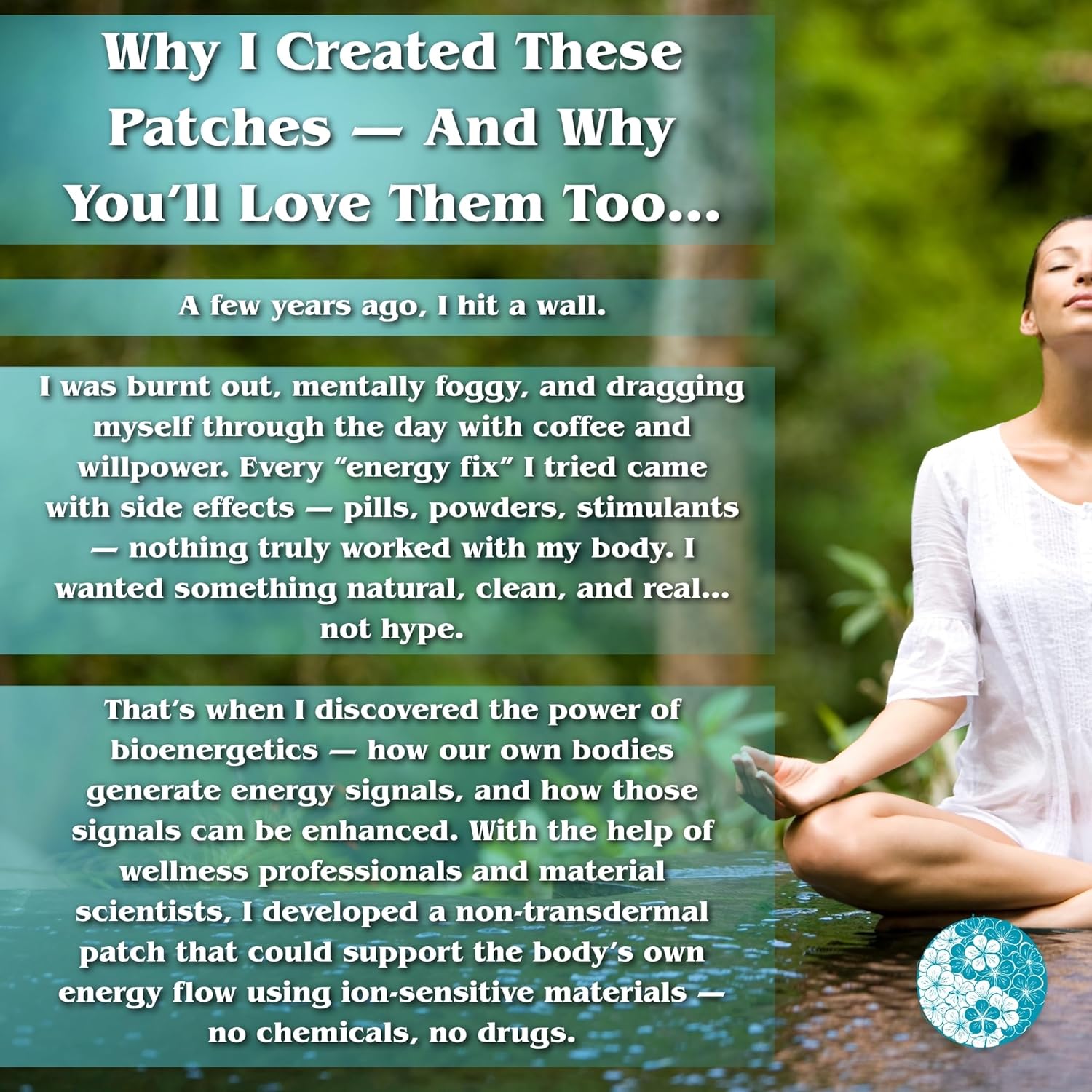 These patches use ion-sensitive, smart materials to interact with your body’s biofield — helping to promote better balance, faster recovery, and enhanced clarity. There are no ingredients, chemicals, or stimulants — just wearable support for a more aligned and energized you.