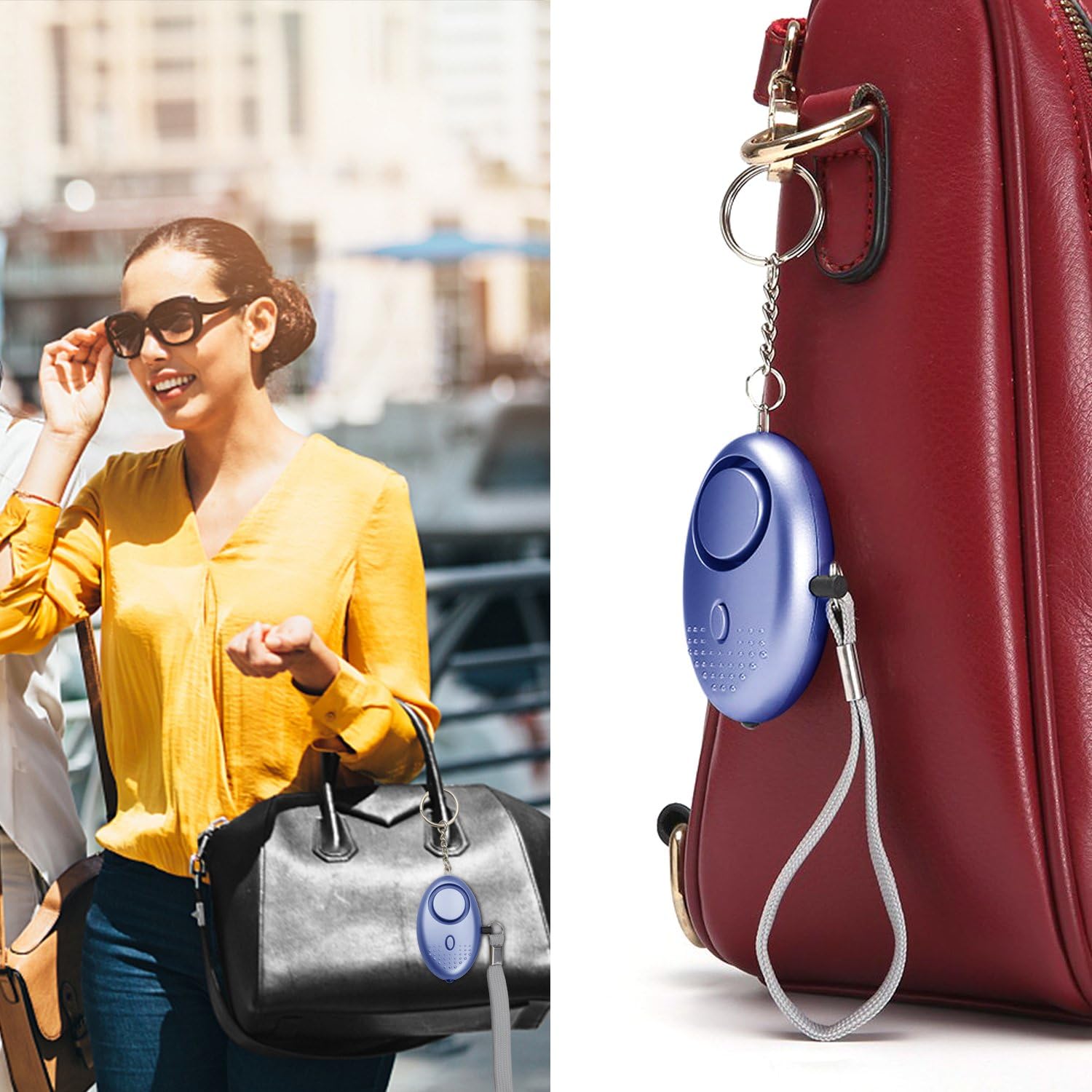 [Portable Design]: The personal alarm has a portable size, can be attached on keychain, backpack, ladies bag,etc.It suit for students, elderly, children, women, night workers and so on.