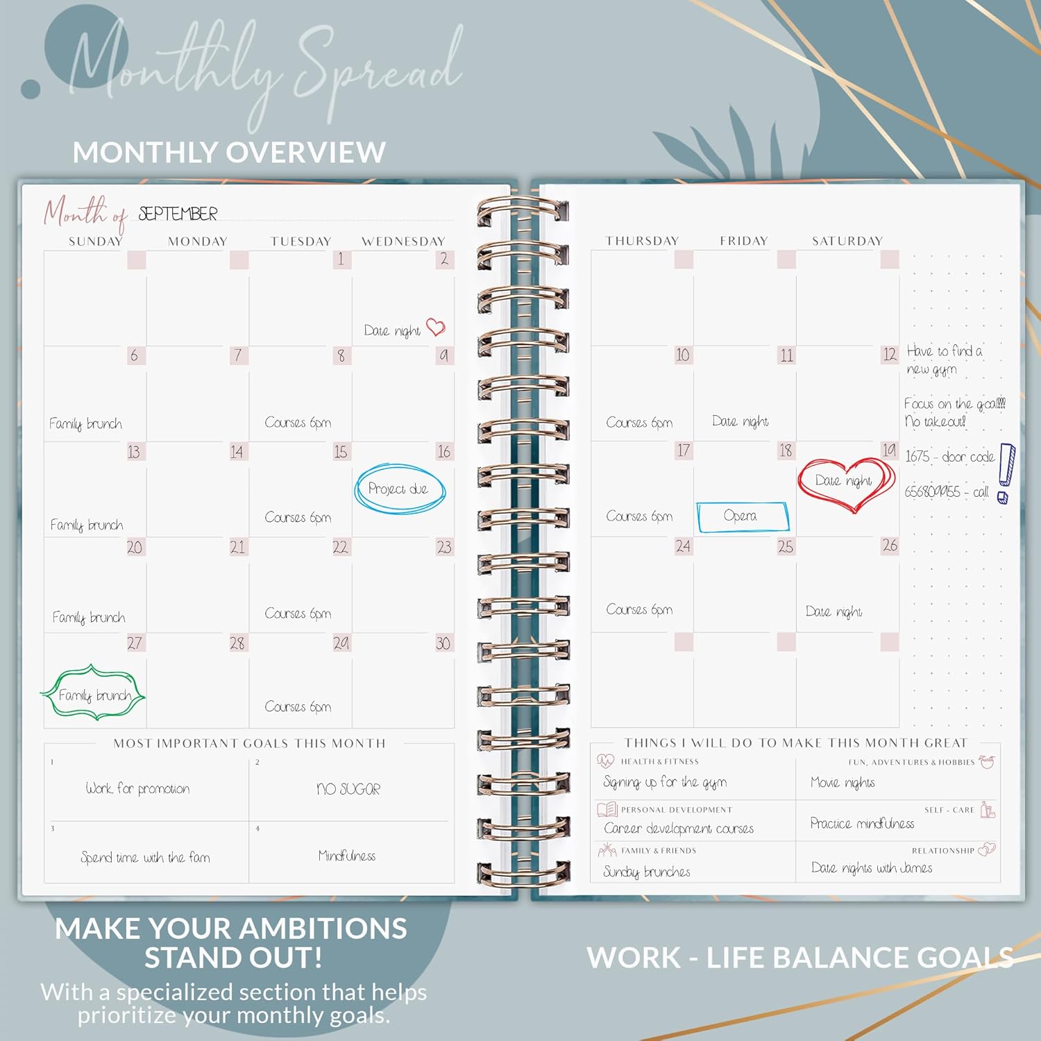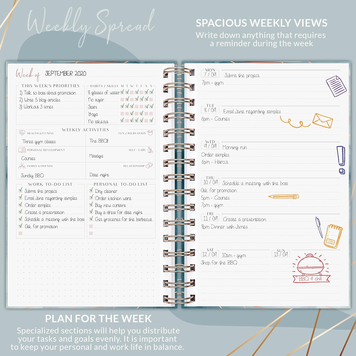 UNDATED PAGES & OTHER FEATURES – This goal setting planner is undated and lasts 12 months so that you can start your weekly task planner anytime. The life planner measures 6.9 inches wide and 8.5 inches long and has A5-sized pages. Thanks to the double wire binding, pages turn easily and lie flat when the to do list planner is open, so you can write comfortably wherever you are.