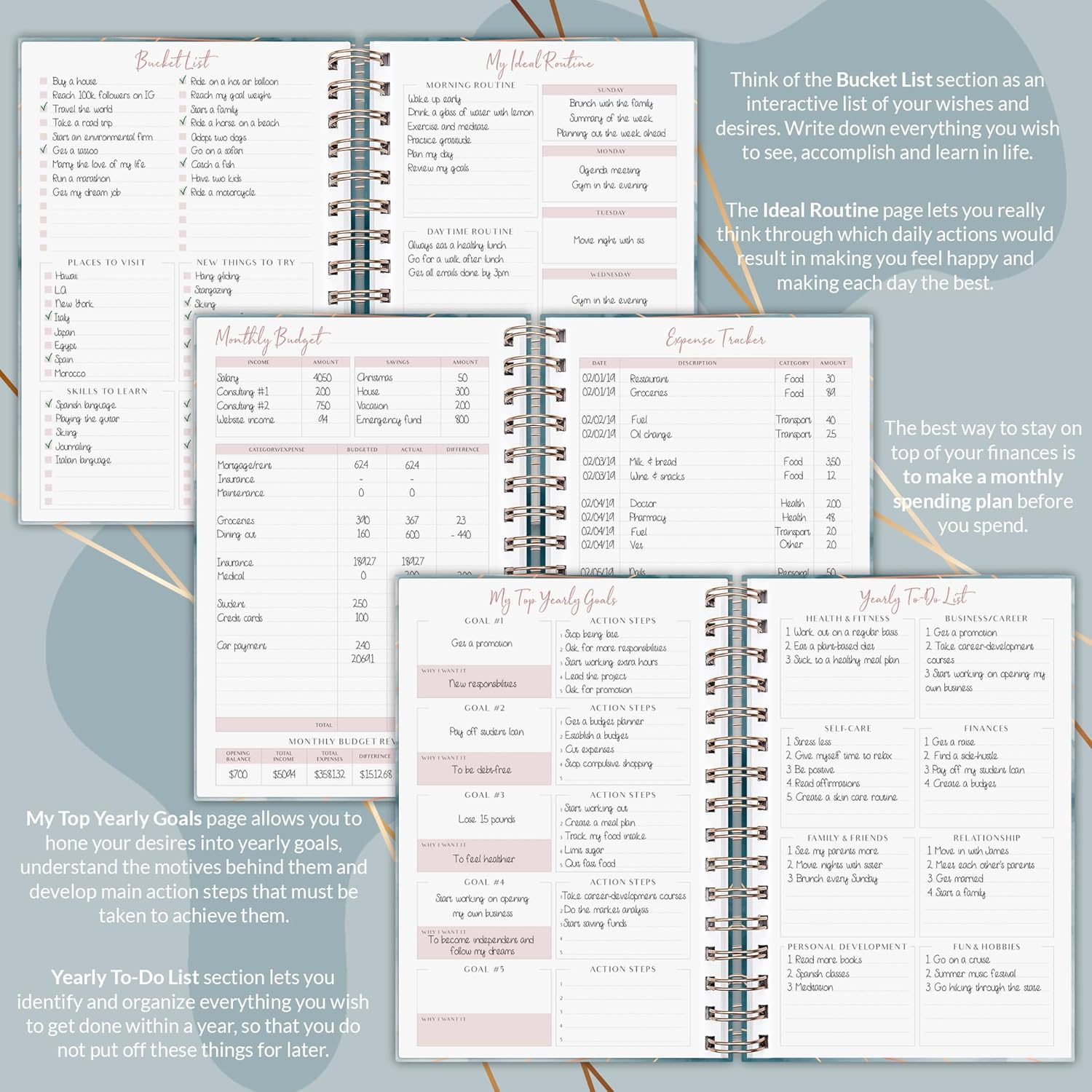 Calming color schemes to encourage focus and section tabs for easy navigation help ensure you get the most out of your year – personally, professionally, and financially.