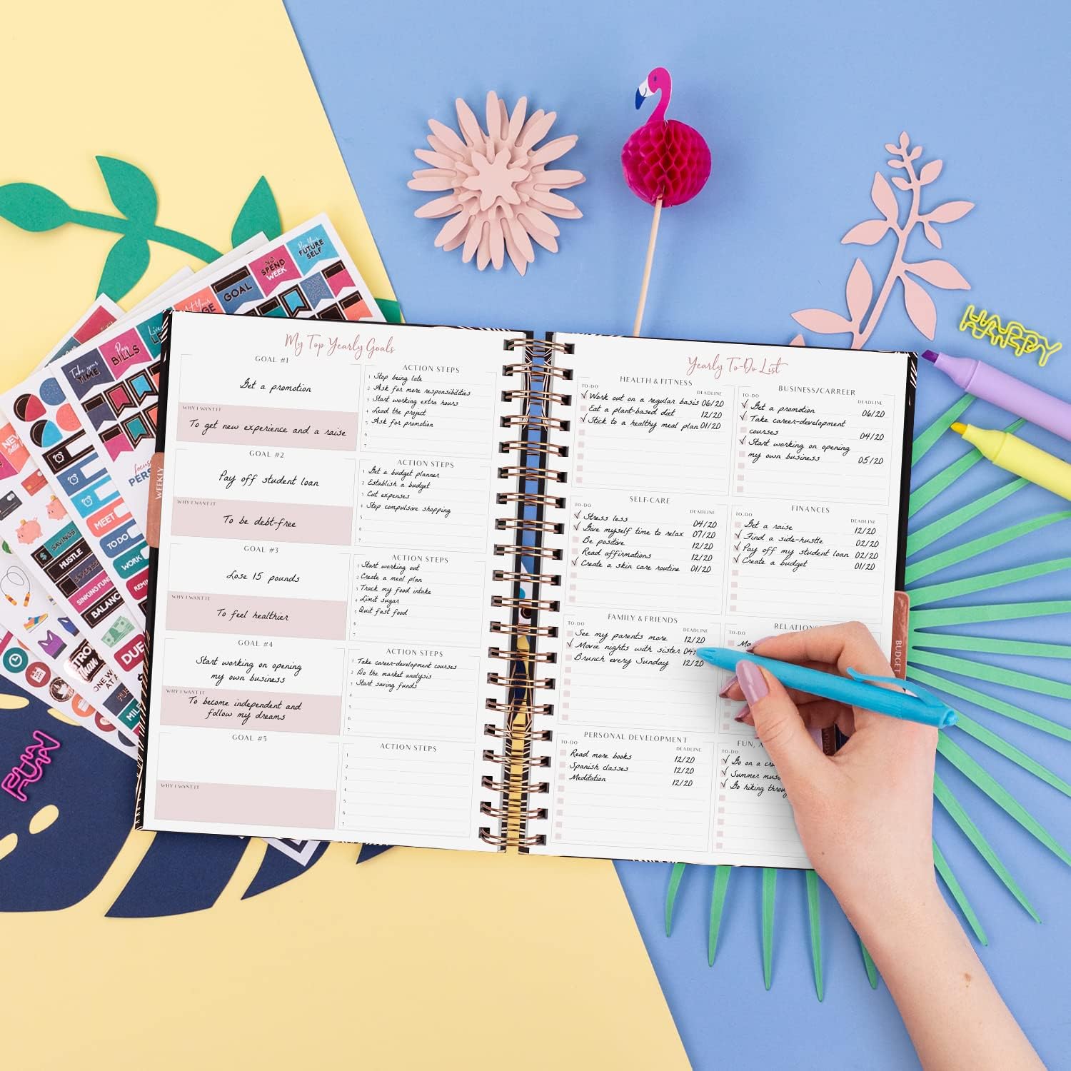 UNDATED PAGES & OTHER FEATURES – This goal setting planner is undated and lasts 12 months so that you can start your weekly task planner anytime. The life planner measures 6.9 inches wide and 8.5 inches long and has A5-sized pages. Thanks to the double wire binding, pages turn easily and lie flat when the to do list planner is open, so you can write comfortably wherever you are.
