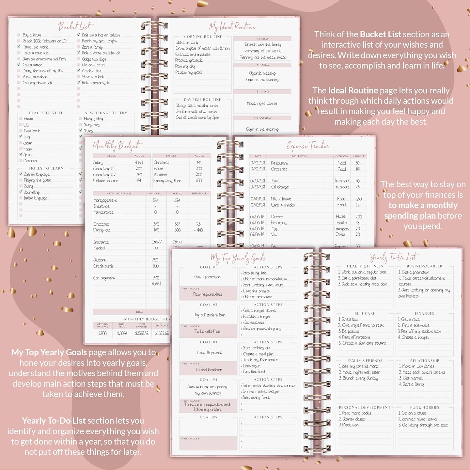 Calming color schemes to encourage focus and section tabs for easy navigation help ensure you get the most out of your year – personally, professionally, and financially.