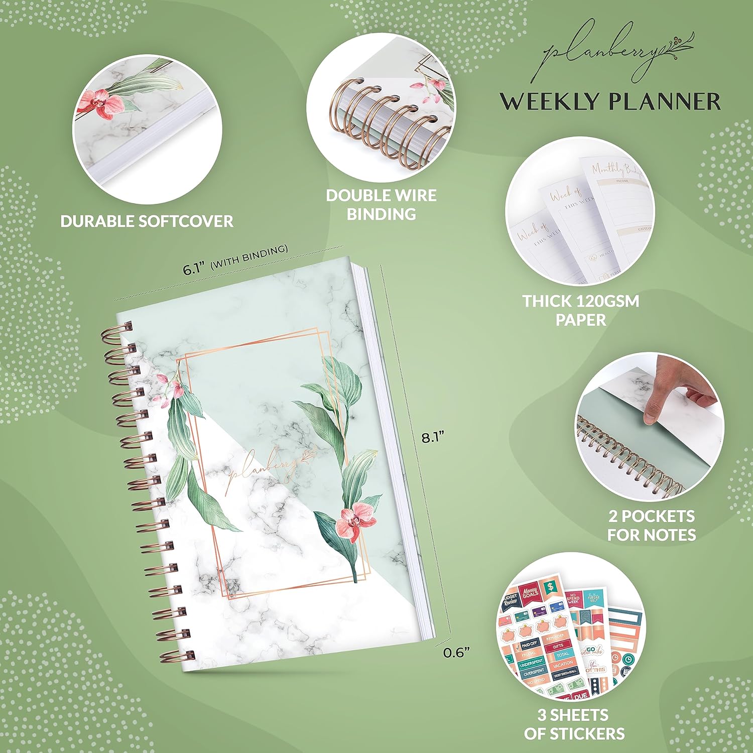 PLANBERRY Weekly Planner – Undated Life Organizer & Budget Planner – Time Management, Goal Setting, To-Do List, Work-Life Balance & Habit Tracker – 6.1″ x 8.1″ (Natural Green)