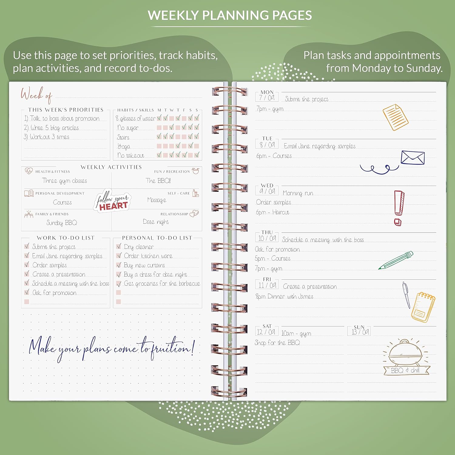 52 weekly spreads to balance your weekly work and personal priorities. Each spread has an overview of your week to break your tasks and activities down by the day.