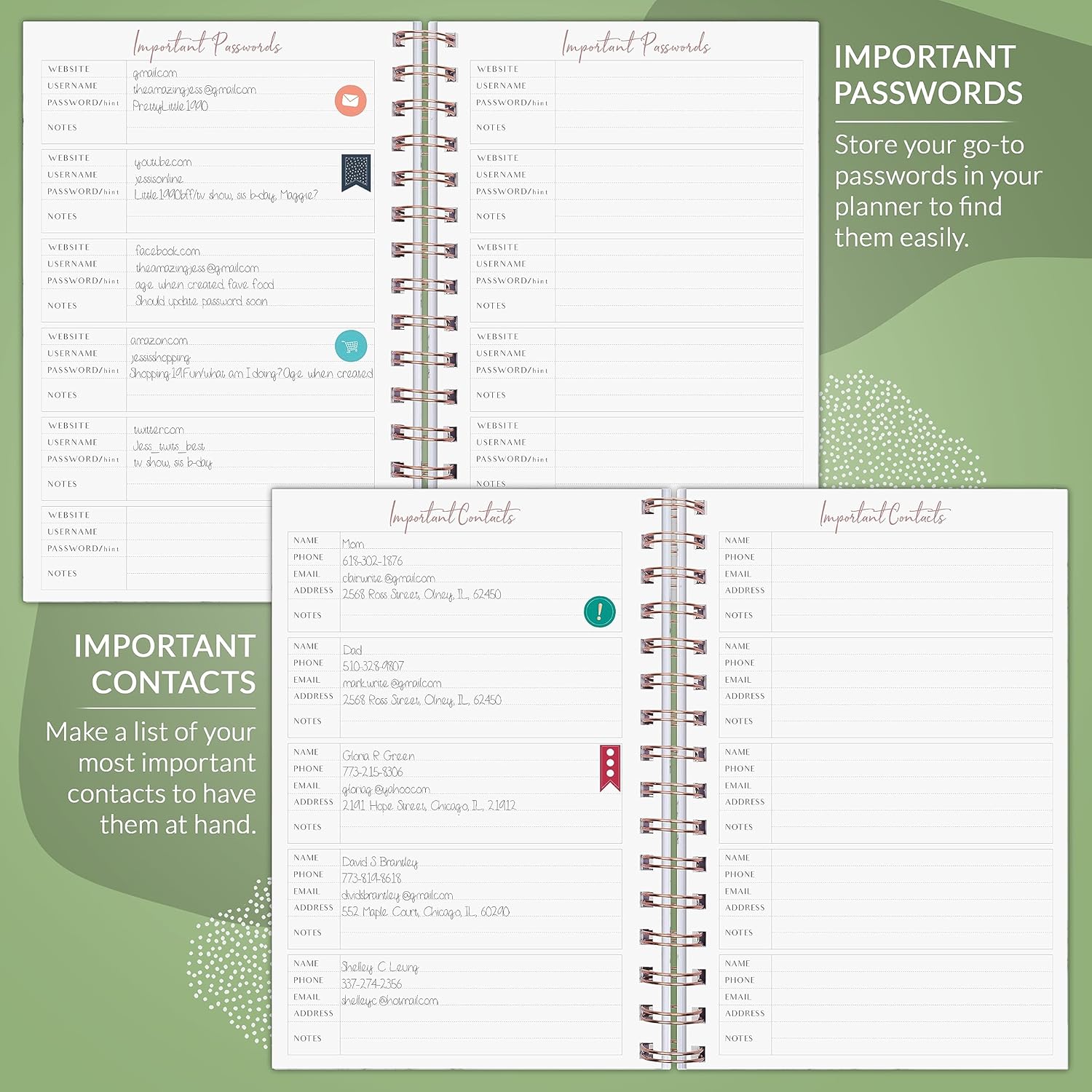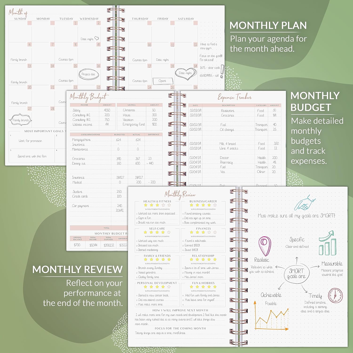 Calming color schemes to encourage focus and section tabs for easy navigation help ensure you get the most out of your year – personally, professionally, and financially.