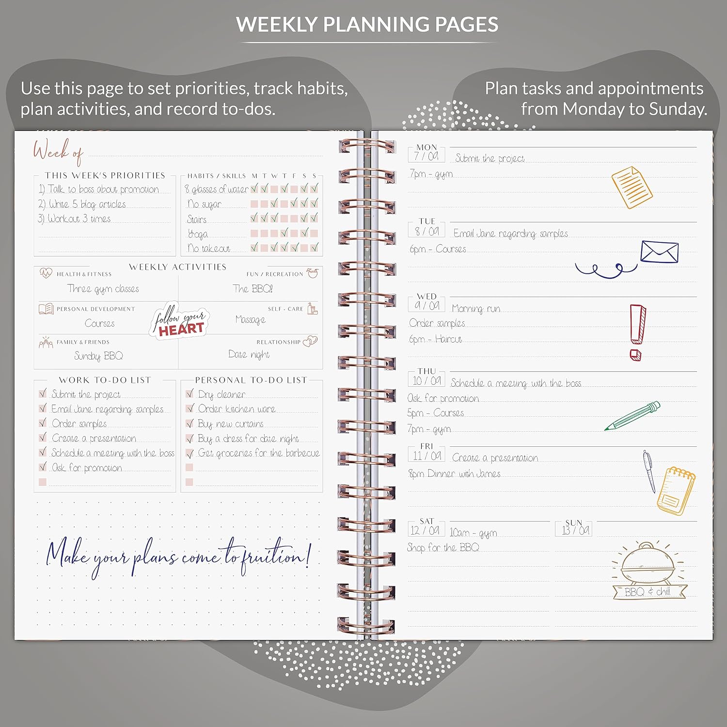 NO-BLEED PAPER, STICKERS & OTHER FEATURES – This agenda planner is made using high-quality materials and has a durable softcover with rose gold detailing, sturdy double wire binding, thick 120gsm bleed-resistant paper, and 2 pockets for loose papers. Inside, you will also find 6 sheets of colorful planning stickers to decorate your to do list planner.