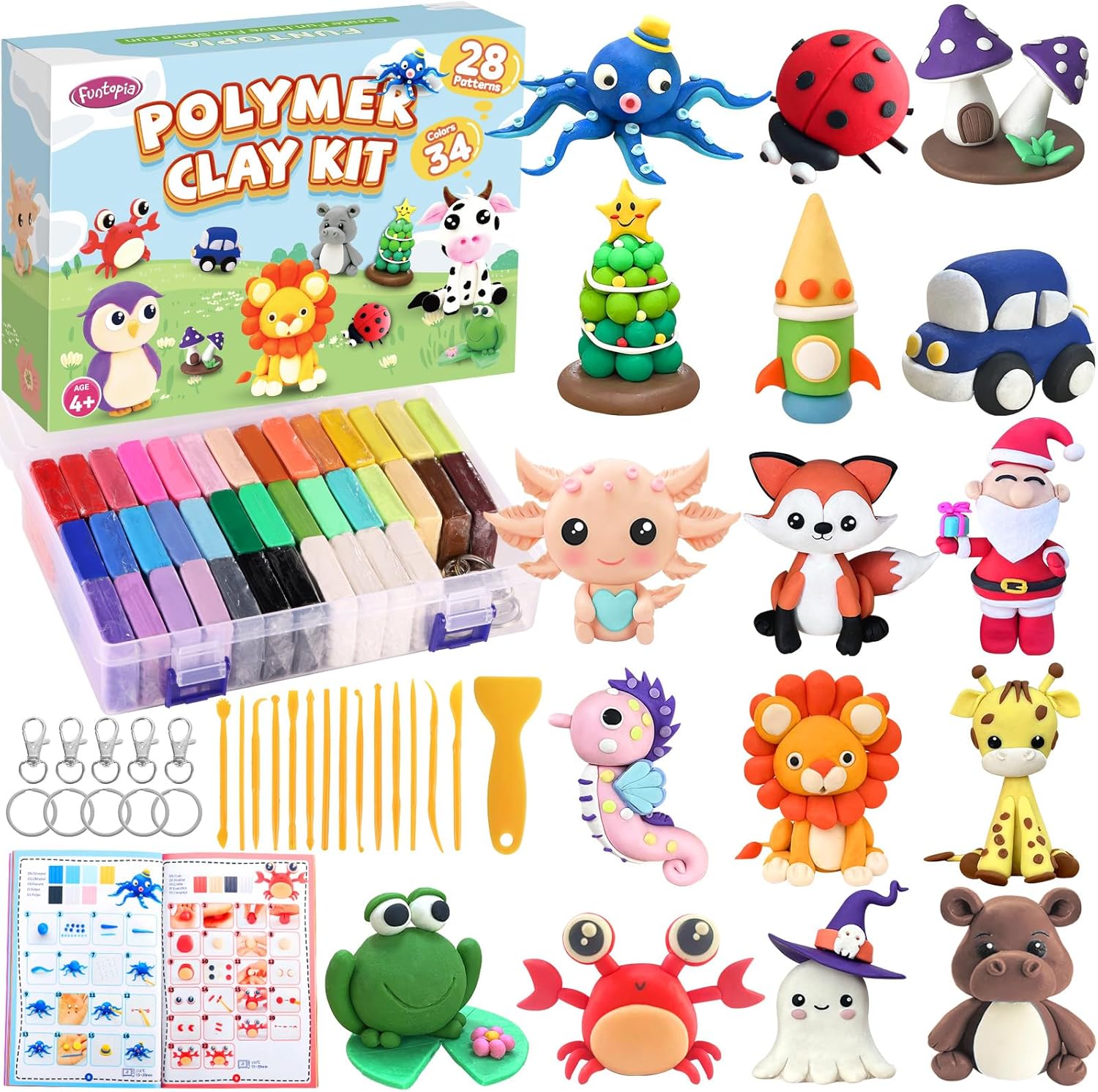 Polymer Clay Starter Kit: This polymer clay set is ideal for beginners. With our detailed tutorial book, kids can easily learn to build 28 cute cartoon designs through imitation. The set includes 39 pieces of clay in 34 colors, including 4 white, 2 black, and 2 red blocks clay, ensuring your child has the essential colors to complete every project without frustration.