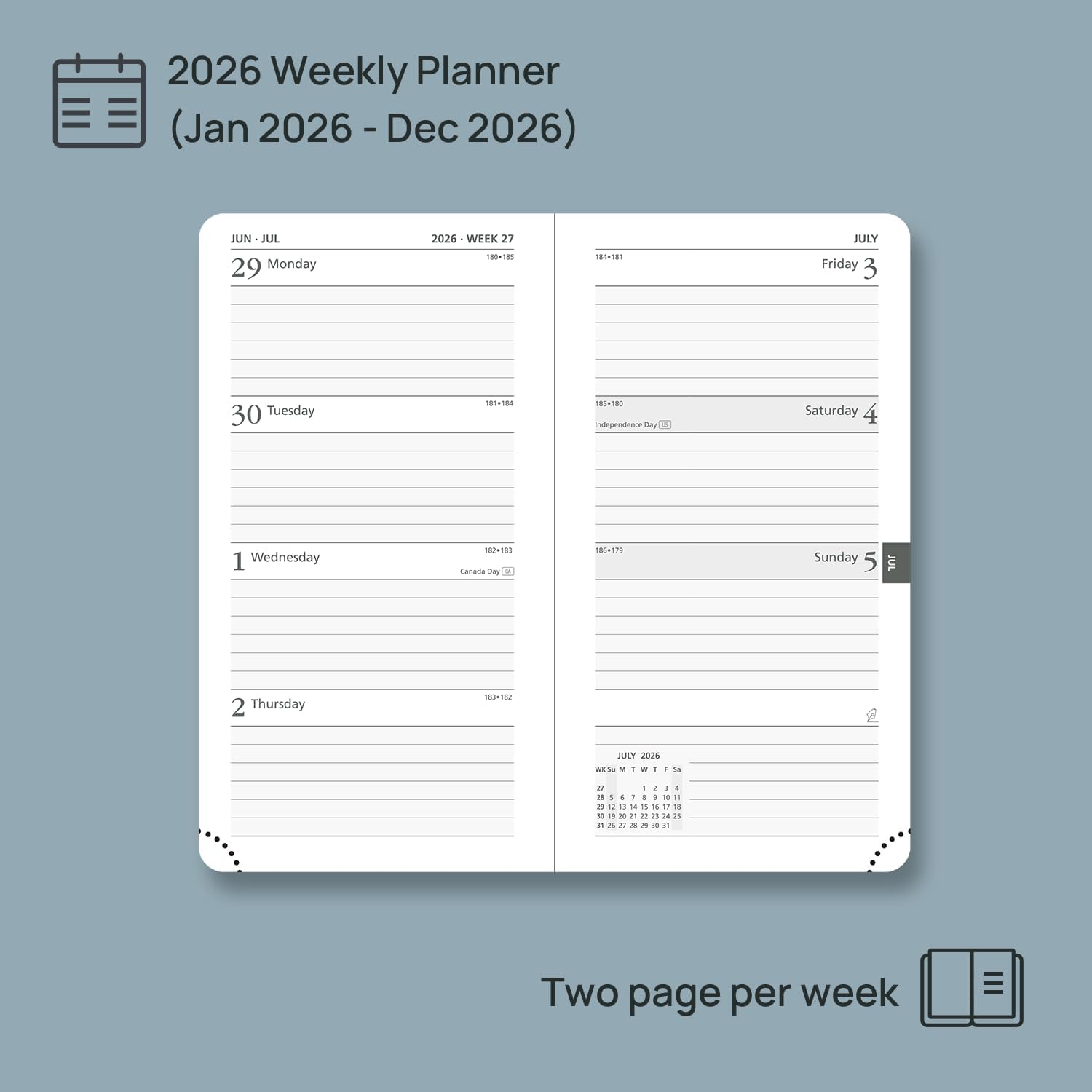 2 PAGES PER WEEK:Lay flat week-to-view on 2 pages, this 12-month weekly planner (Jan. 2026 – Dec. 2026) presents spacious everyday planning for your appointments, which makes your busy daily routines organized.