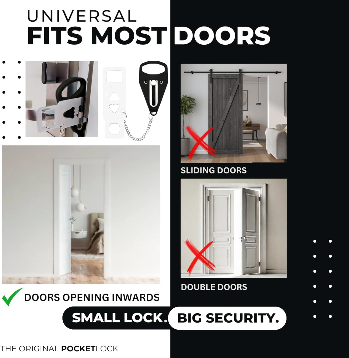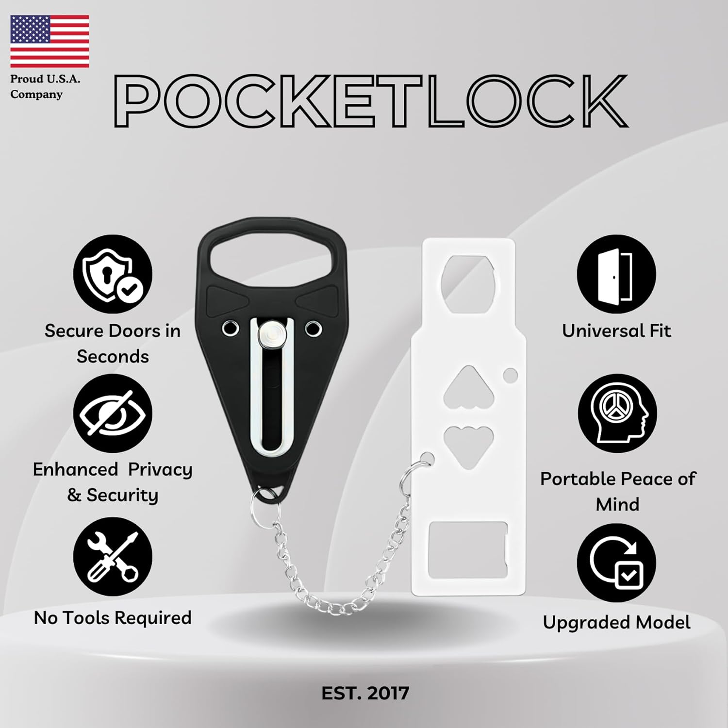 Take control of your personal safety wherever you go with the PocketLock Portable Door Lock and Door Stop Alarm Set, the ultimate travel security solution for hotels, Airbnbs, dorms, apartments, and home use. This compact 2-in-1 kit combines our best-selling portable door lock with a powerful 120dB door stop alarm to provide layered protection against unwanted entry. The portable door lock installs in seconds with no tools required, securing most inward-opening doors from the inside. It creates an extra barrier that hotel staff, landlords, or intruders can’t bypass, giving you privacy and peace of mind. The door stop alarm wedges firmly under the door with a non-slip rubber base and instantly activates a loud siren if forced entry is attempted, blocking access while alerting you and deterring intruders. With adjustable sensitivity settings and battery operation, it adapts to any environment and works even during power outages. Designed to be lightweight and travel-friendly, both devices fit easily into a backpack, suitcase, or handbag, so you never have to sacrifice safety when you’re on the move. Ideal for women, solo travelers, college students, seniors, and families, this set is the perfect way to protect yourself and your loved ones—whether you’re at home or away. PocketLock: Small Kit. Big Security.