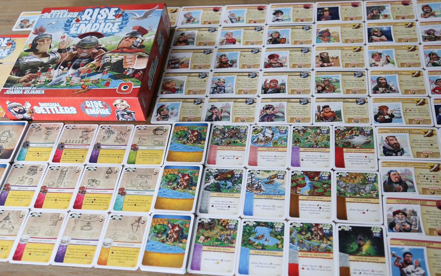 Rise of the Empire is an expansion for Imperial Settlers, an easy-to-learn engine building, card drafting, tableau building, resource management, and civilization strategy game for 1 – 4 players, designed by Ignacy Trzewiczek and published by Portal Games. The game has become a worldwide phenomenon and received many expansions with additional factions and new card decks. Rise of the Empire is different, as it introduces a brand new game mode: the Open World campaign, where players strive to quickly go through all the Eras, from Ancient to Modern. The campaign can be played with a changing playgroup. New players can join any time because it mimics the history with new empires rising when the other ones were already highly developed.The game mechanics compensate for those differences keeping the game balanced.