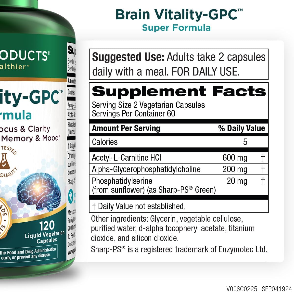 Brain Vitality-GPC Capsules contains Phosphatidyl Serine (PS) which supports healthy memory and healthy brain aging.*